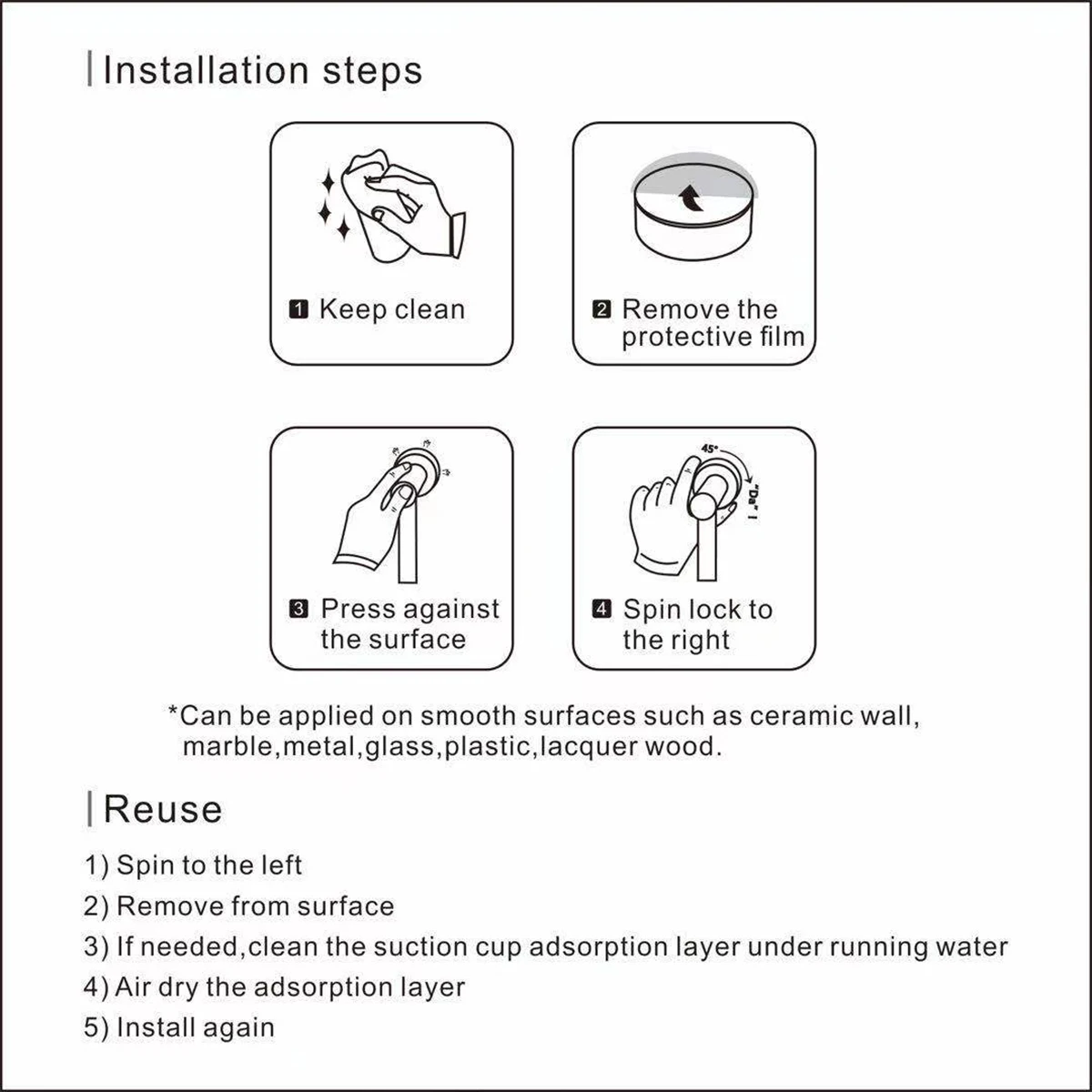 *Easy Install & Reusable-Vacuum suction cup hooks is easy to install it, no tools, no drilling, no surface damage, just a few seconds to finish installation, Press the section cup hooks to release the air and twist the knob cap clockwise by hands (until hearing a "Click"sound ) to lock the suction cup on a smooth surface after cleaning with coming cleaning cloth. (Please see the instructions).Support for repeated use, simply wash the suction cup by water after removing, then follow the complete installation instructions to reuse it after drying.Thus the hooks can hold firm than adhesive hook. This organizer suction cups hooks have keeps your room clean, tidy and saves more space.
