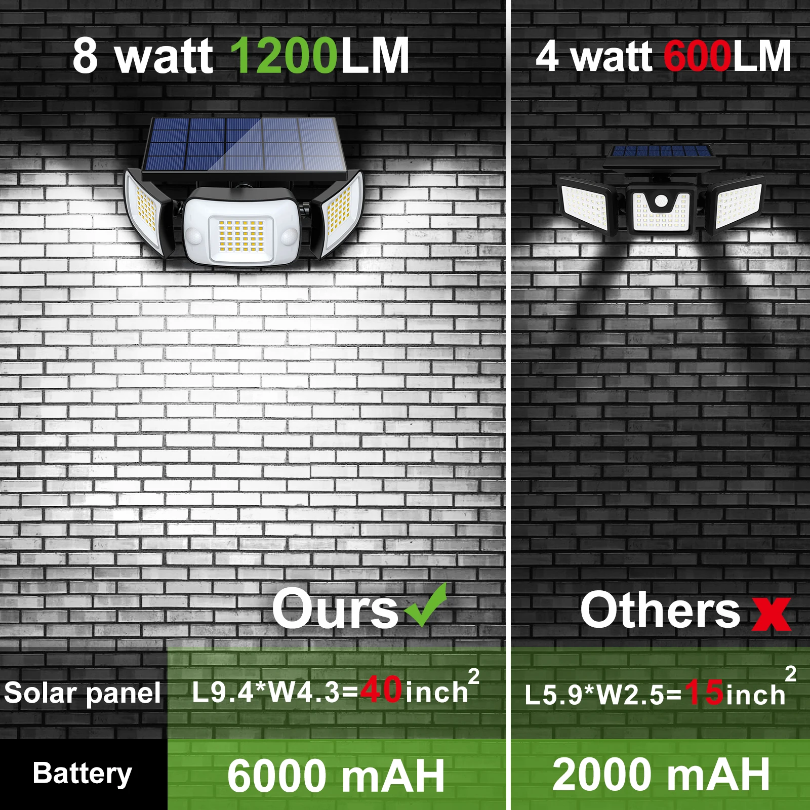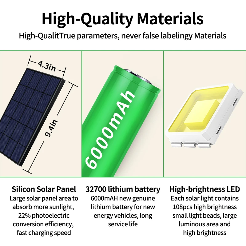 (3) Equipped with 108 super bright LED beads, produce up to 1200lm 6500K high brightness output with good heat dissipation, which is far brighter than other similar LED solar lights.
