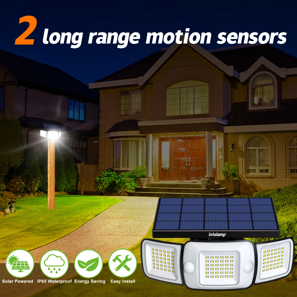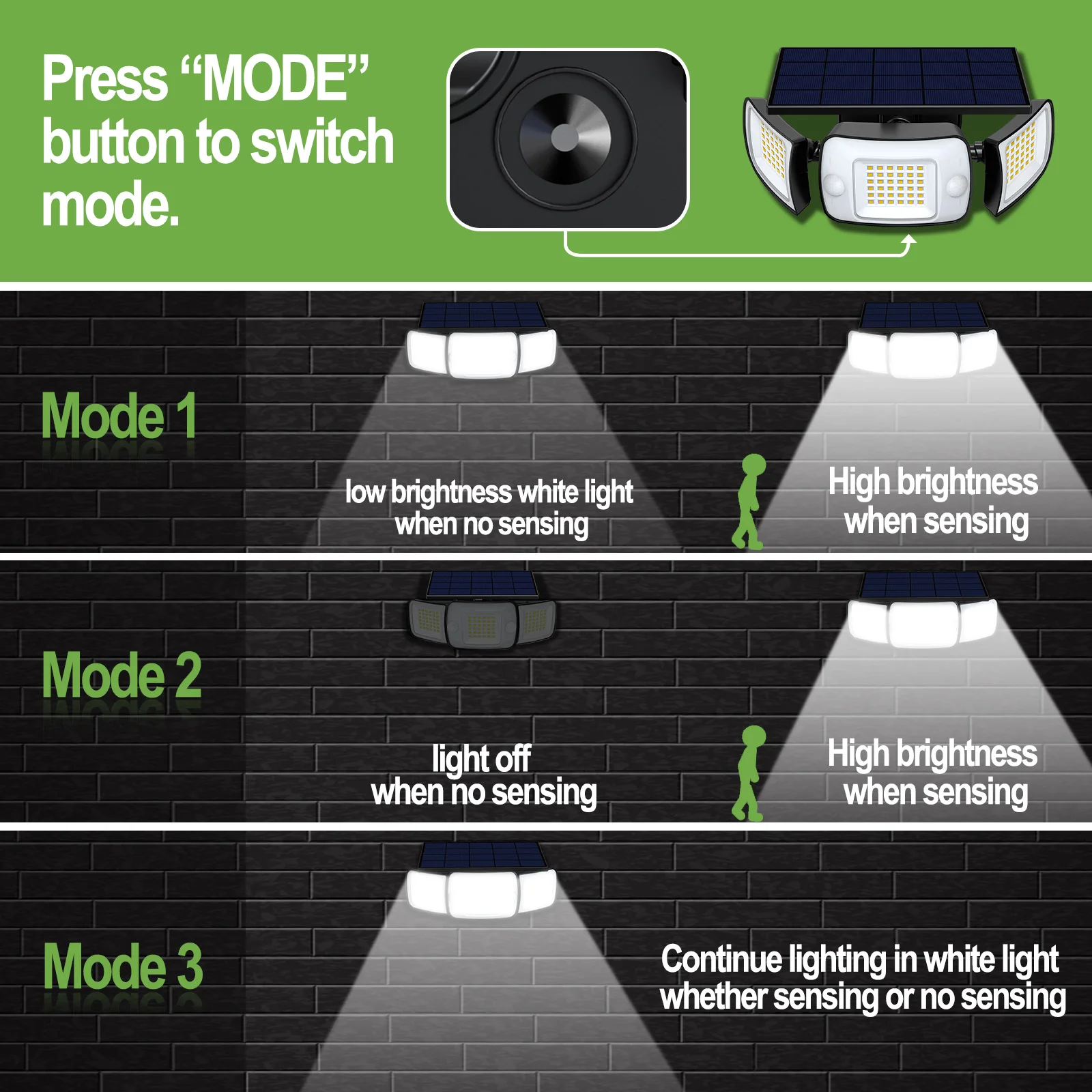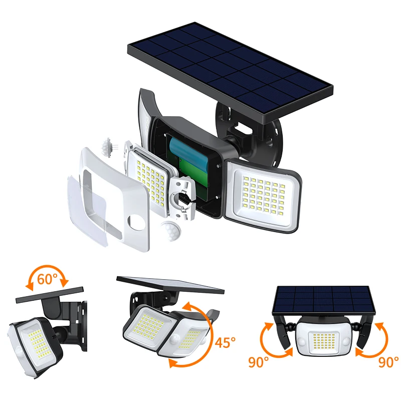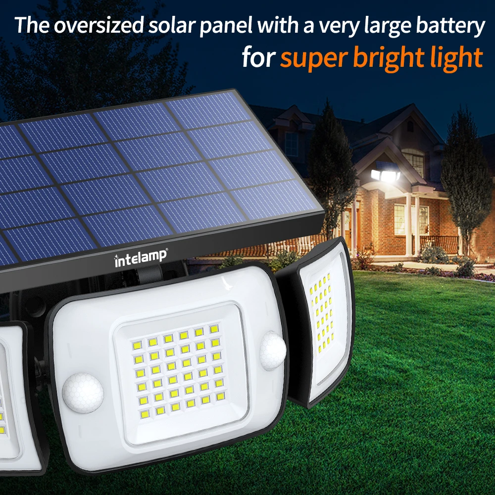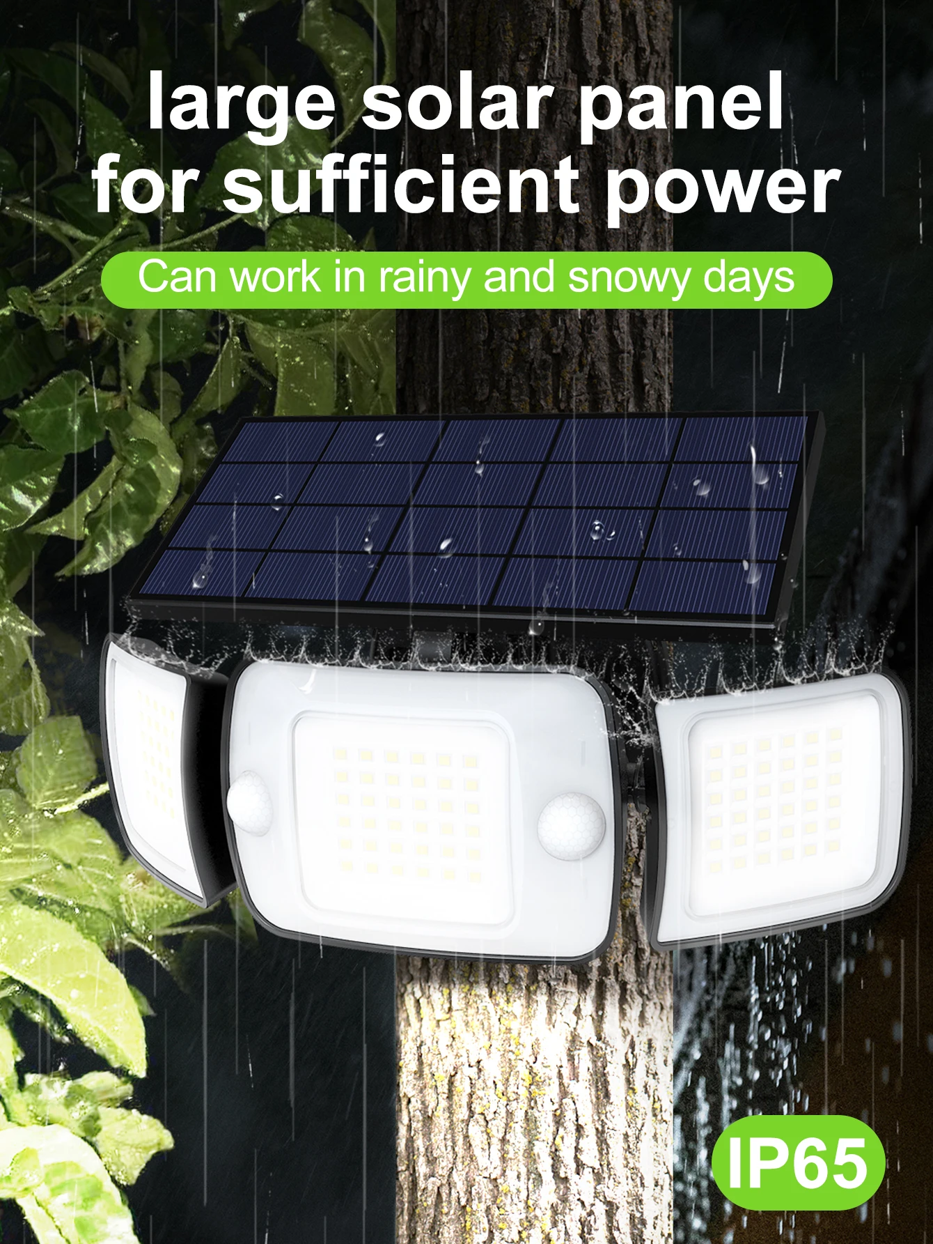 The solar flood lights can adjust the 3 lamp heads providing an industry leading 270°Wide angle of illumination, a sensing distance up to 25ft.