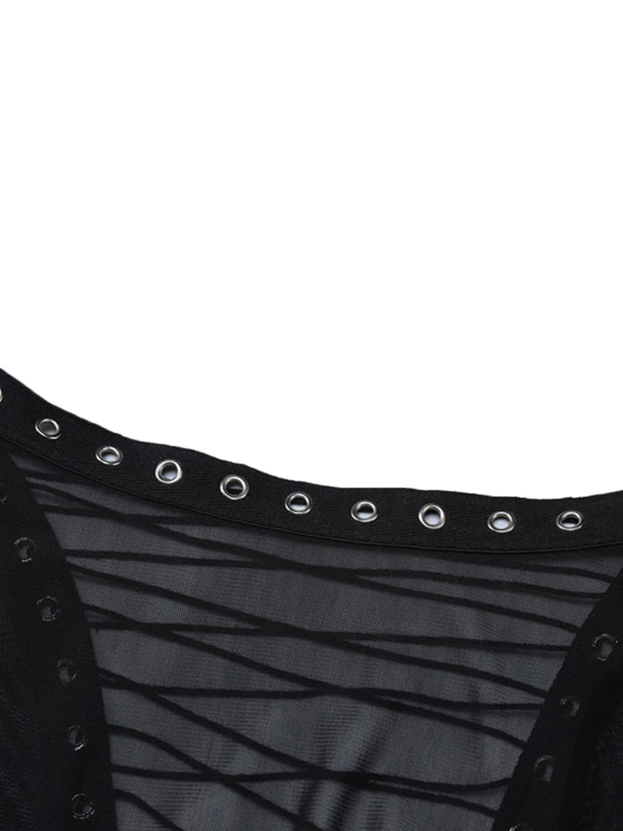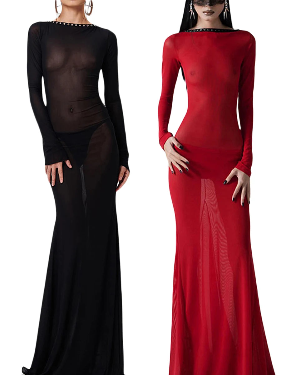Women Long Bodycon Dress Solid Color See-Through Mesh Sheer Dress Long Sleeve Cross Tie-Up Backless Evening Party Dress