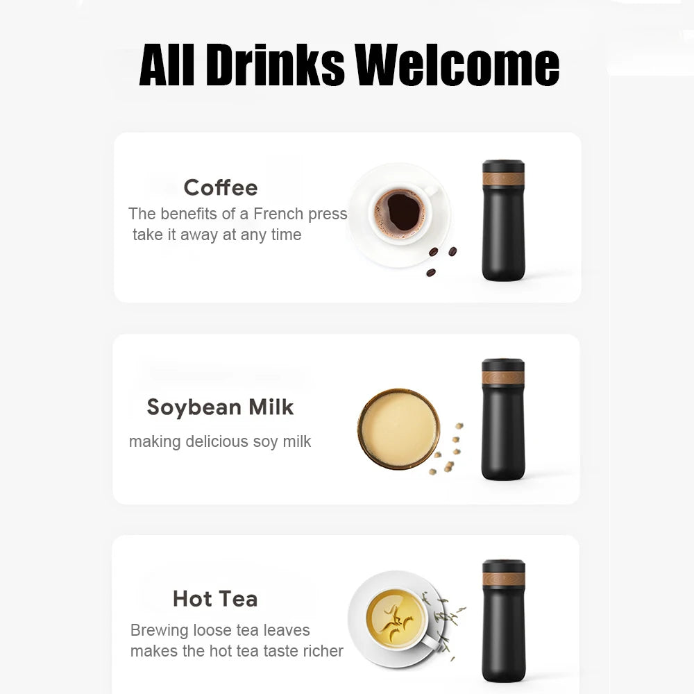 Ideal Gifts: Our French press travel mug is the perfect gift for anyone who loves coffee. Whether it's for a birthday, anniversary, or holiday, this coffee press is sure to impress and provide a delicious cup of coffee every time. The step of operation is: Unscrew the lid and add coffee ground, and hot water, waiting for 3 minutes, then press plunger slowly; finally screw the lid and enjoy coffee.
