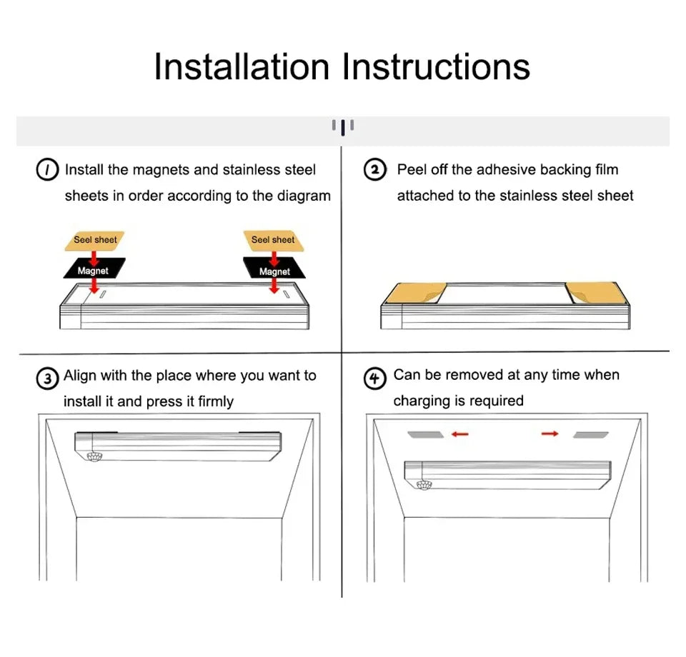 3: Rechargeable: It can be used for a long time on a single charge. The fixing method is magnetic suction. Peel off the adhesive on the back of the magnet in the package and stick it on the wall or cabinet. The sensor light can be attached to the magnet.