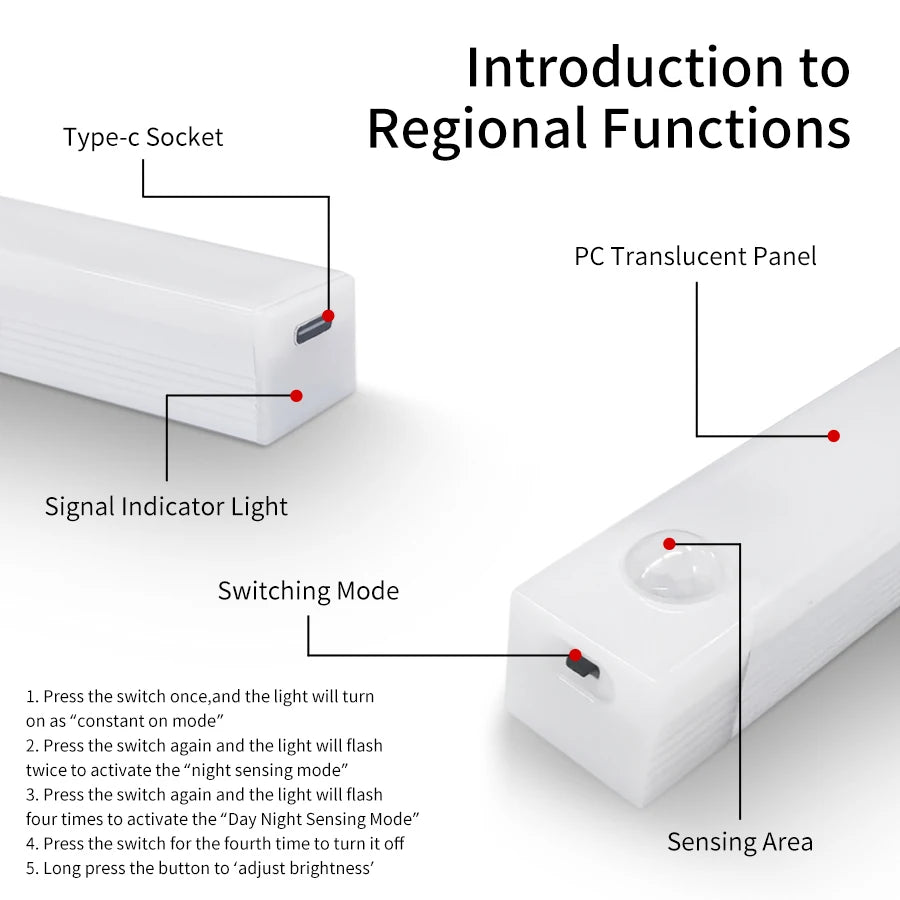 4: Steady light and induction: Press the switch once for constant light, the second time for induction, press the switch again to turn off.