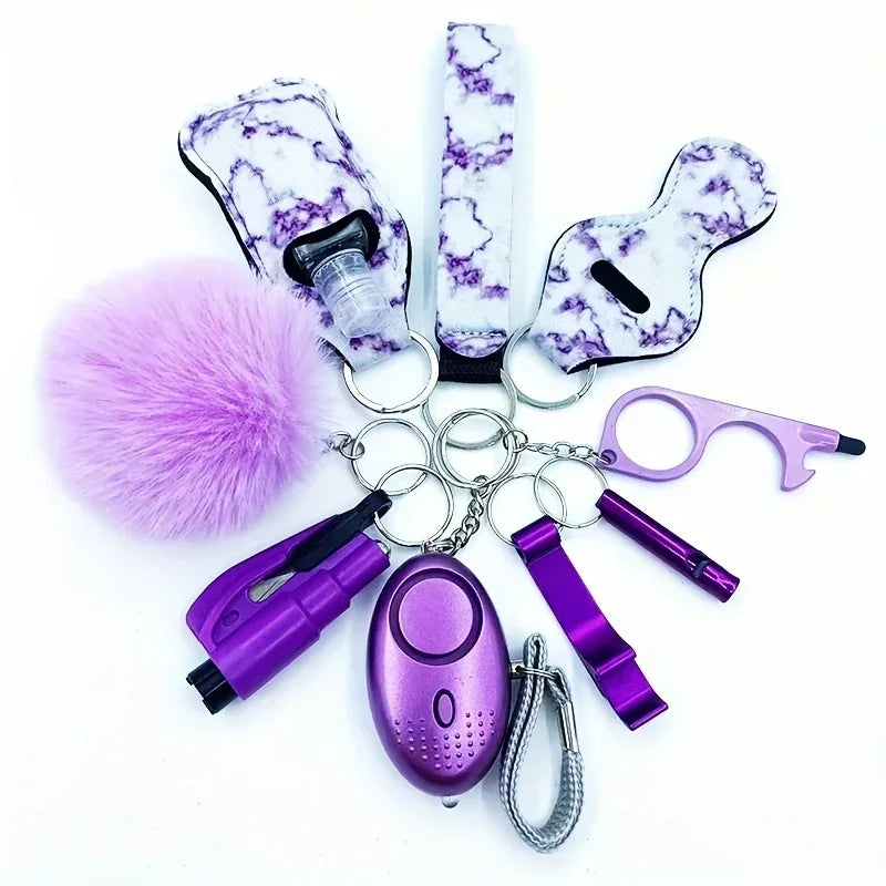 【10-in-1 Safety Keychain Full Set 】Order one personal alarm safety keychain set, you can receive a wristlet, a personal alarm with LED Light, a whistle, a bottle protective cover with an empty bottle, 2 pcs lipstick bags, a bottle opener, a door opening artifact and a cute Pom Poms ball.