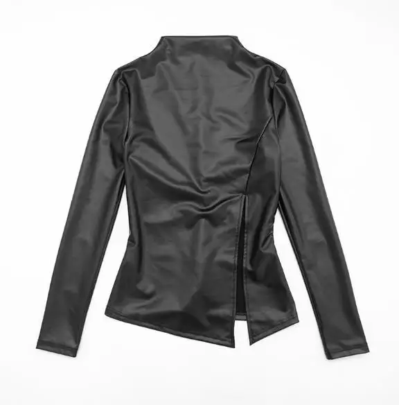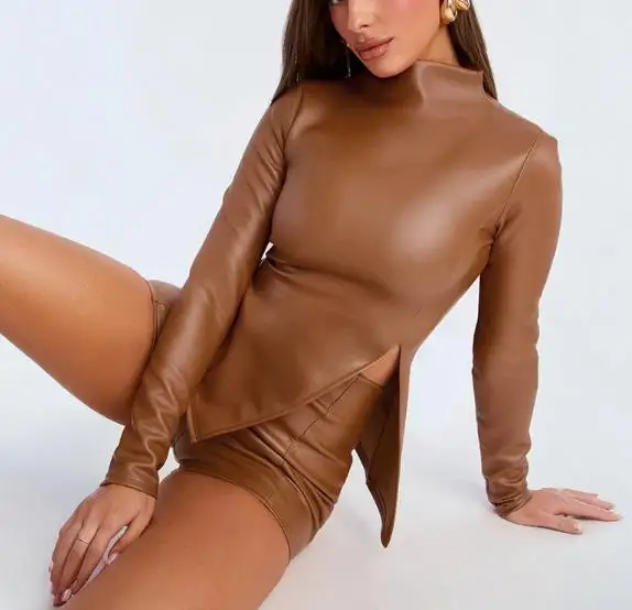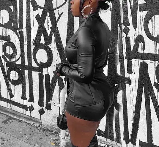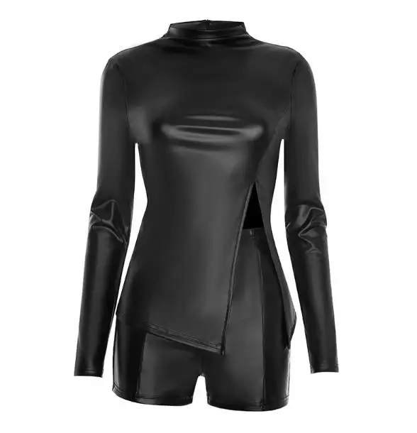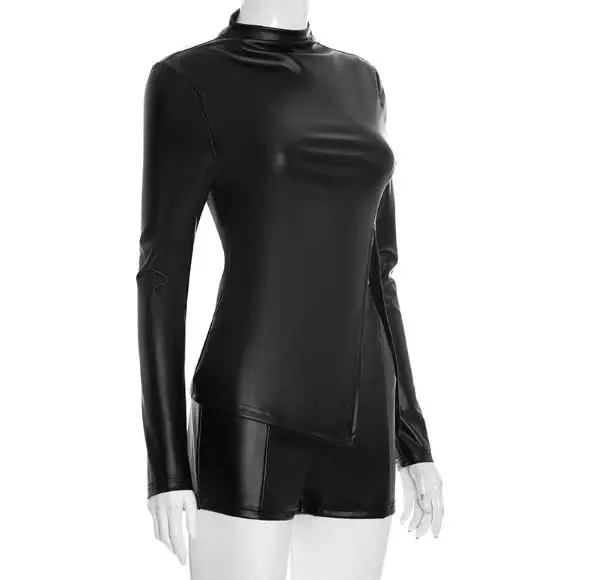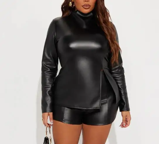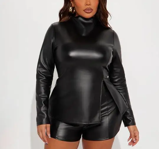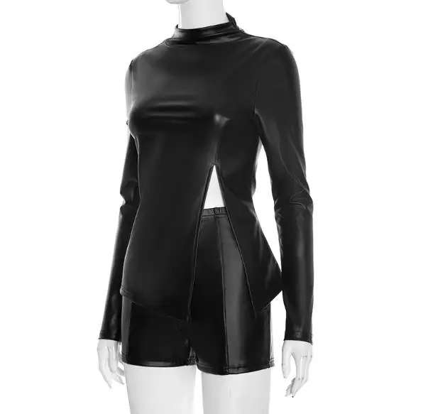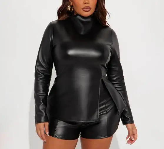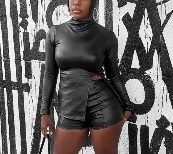 Two Piece Set Women Outfit Spring New Solid Color High Neck Long Sleeve Zipper Split Leather Jacket & High Waist Shorts Set