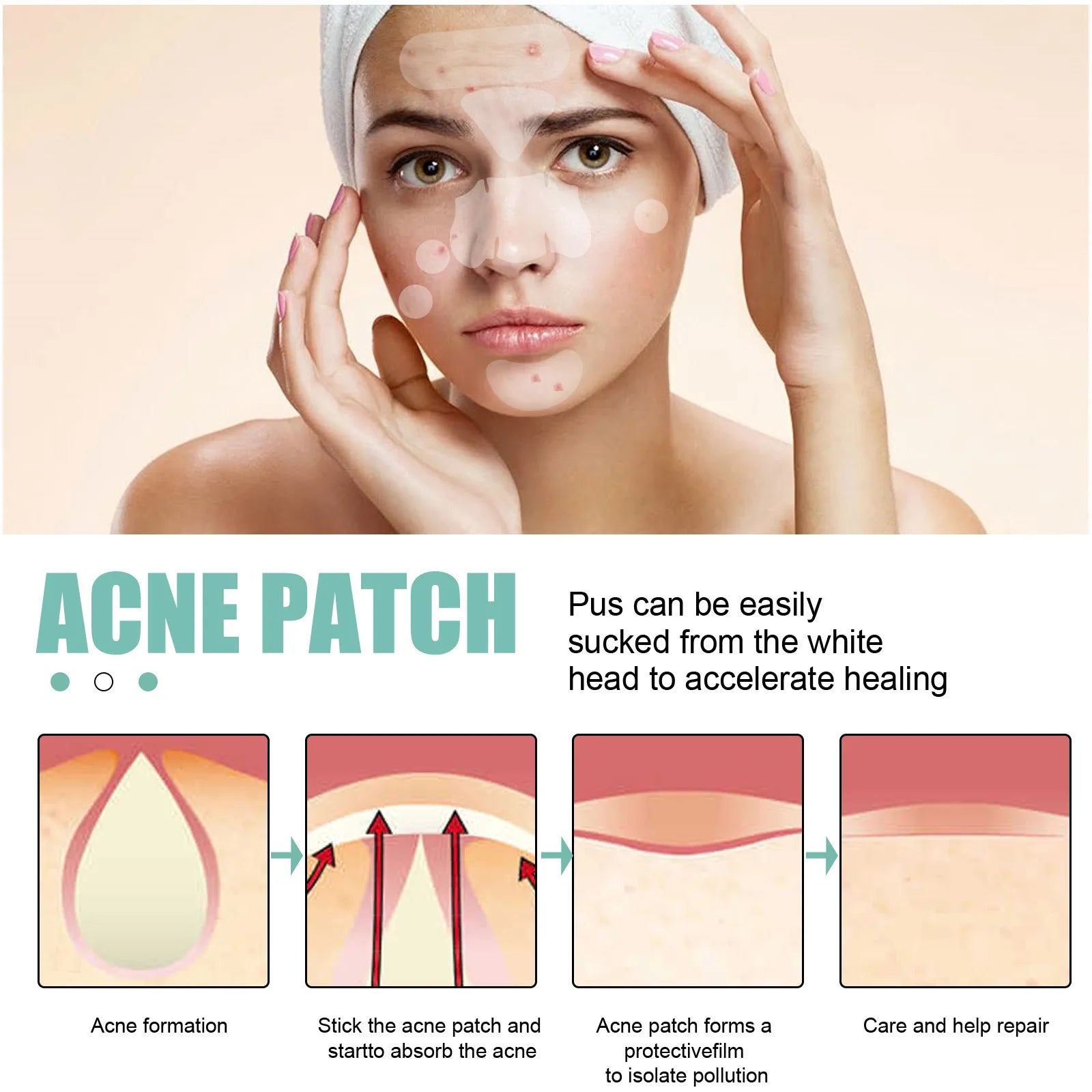 Acne mask patch with strong adhesion, won't fall off even overnight. Improve pimples, acne and pore problemsMulti-benefit ingredients moisturise and repair.1. Cleanse the skin.2. Peel off the patch.3. Cover the target area.4. Leave on for 6-8 hours for best results. Easily draws out pus from whiteheads to accelerate healing. Acne Formation The acne patch is applied and starts to absorb the pimples. The acne patch forms a protective film that cares for and helps to repair and isolate the pollution. Sweeps away acne marks lightens acne marks smoothes pimples without drying or irritating the skin.