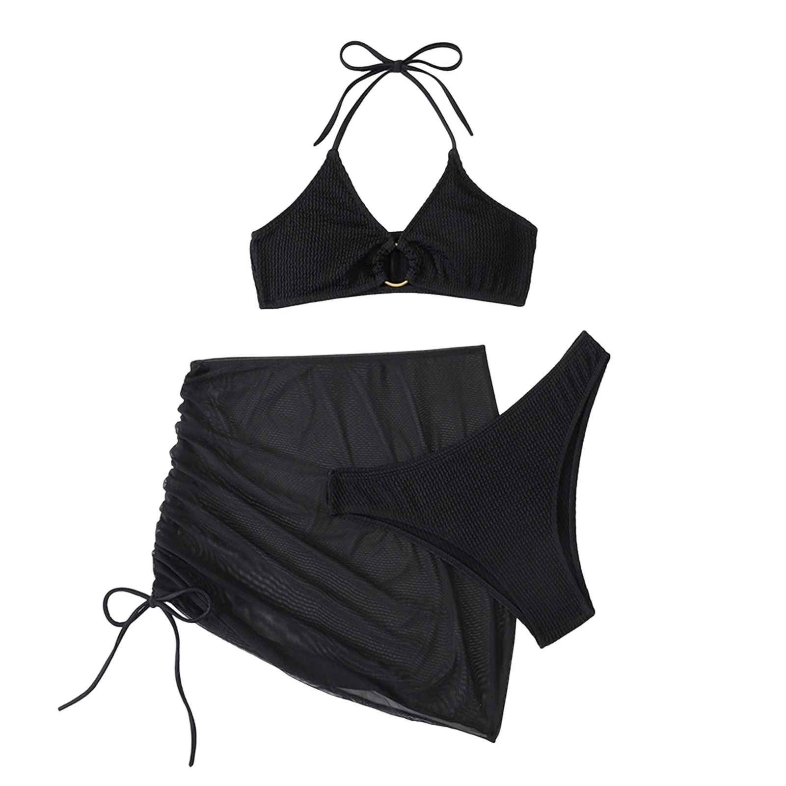 3Pcs/Set Women Bikini Set V-Neck Halter Triangle Cup Drawstring Swimming Bra Briefs Set with Cover Up Beachwear