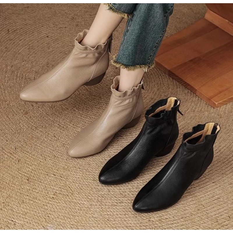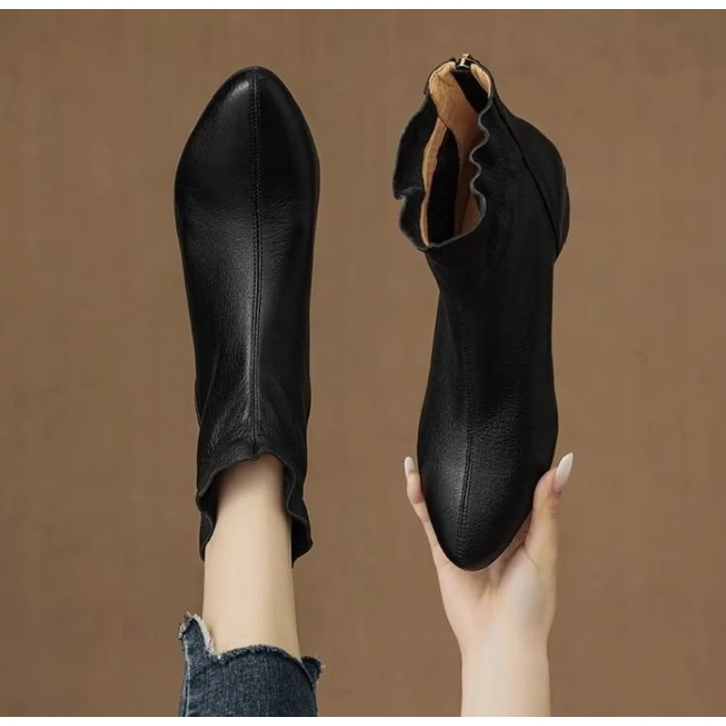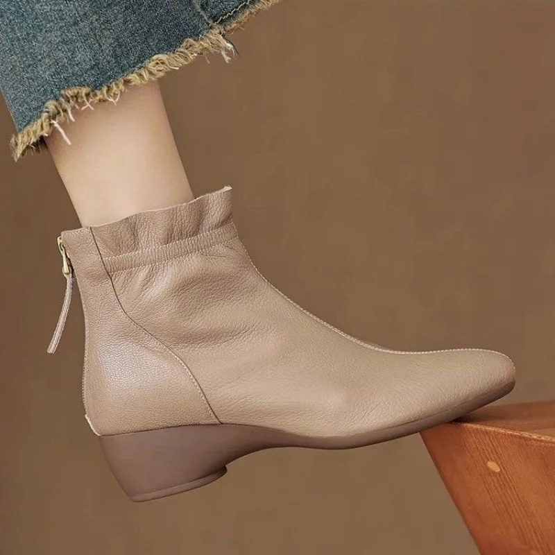 2025 Autumn Winter New Women's Soft Leather Ankle Boots - Block Low Heel, Side Zipper, Comfortable for Commuting