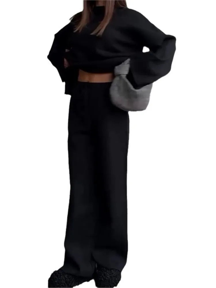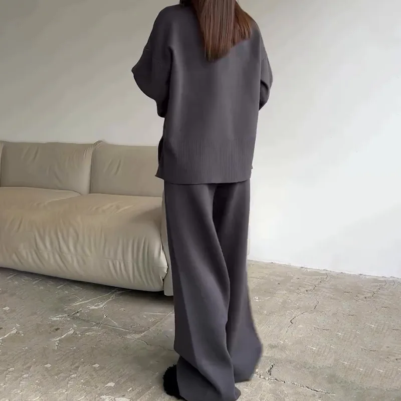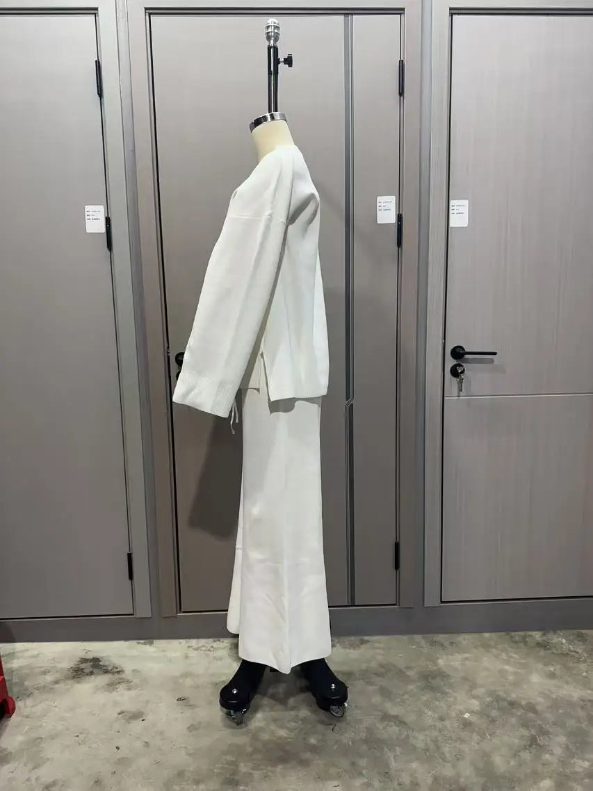2025 Solid Color Knitted Sweater Two Piece Set Women Fashion Loose O Neck Knitting Pullover Trousers Sets Female Simple Style