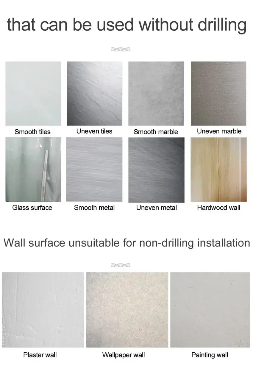 These work only on non-porous,smooth surfaces such as polished ceramic tile,mirror, glass window, polished stainless steel wall and plastic board etc, won't work on any porous, bumpy, rough or textured surfaces such as textured wall,rough coating surface, unpolished marble or wooden door, rugged porcelain surface etc.