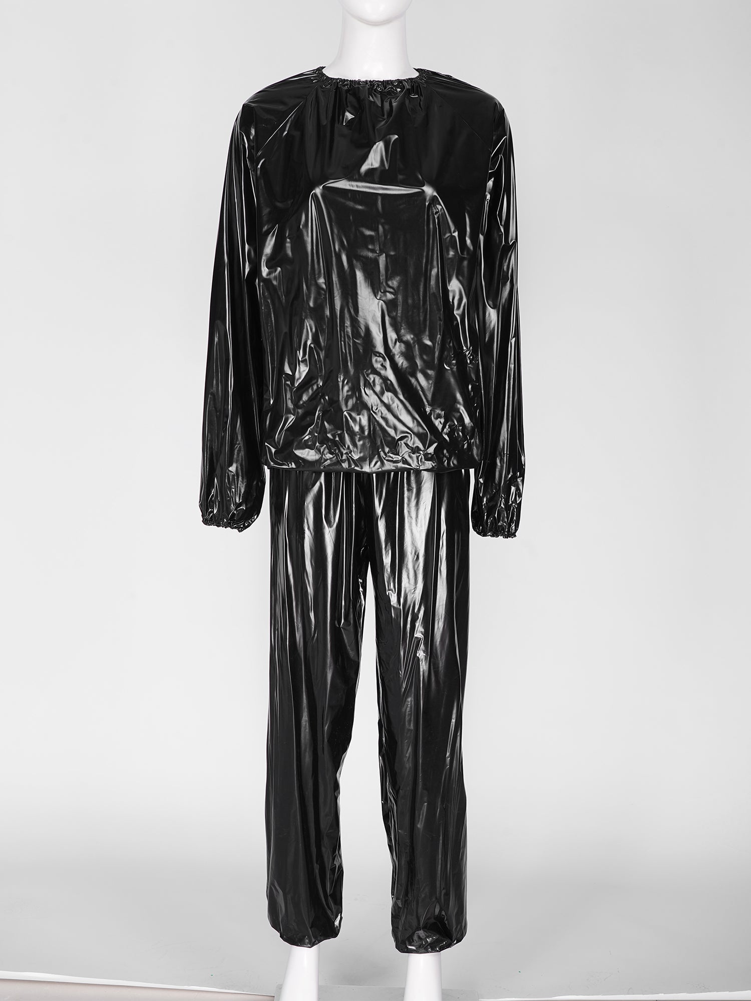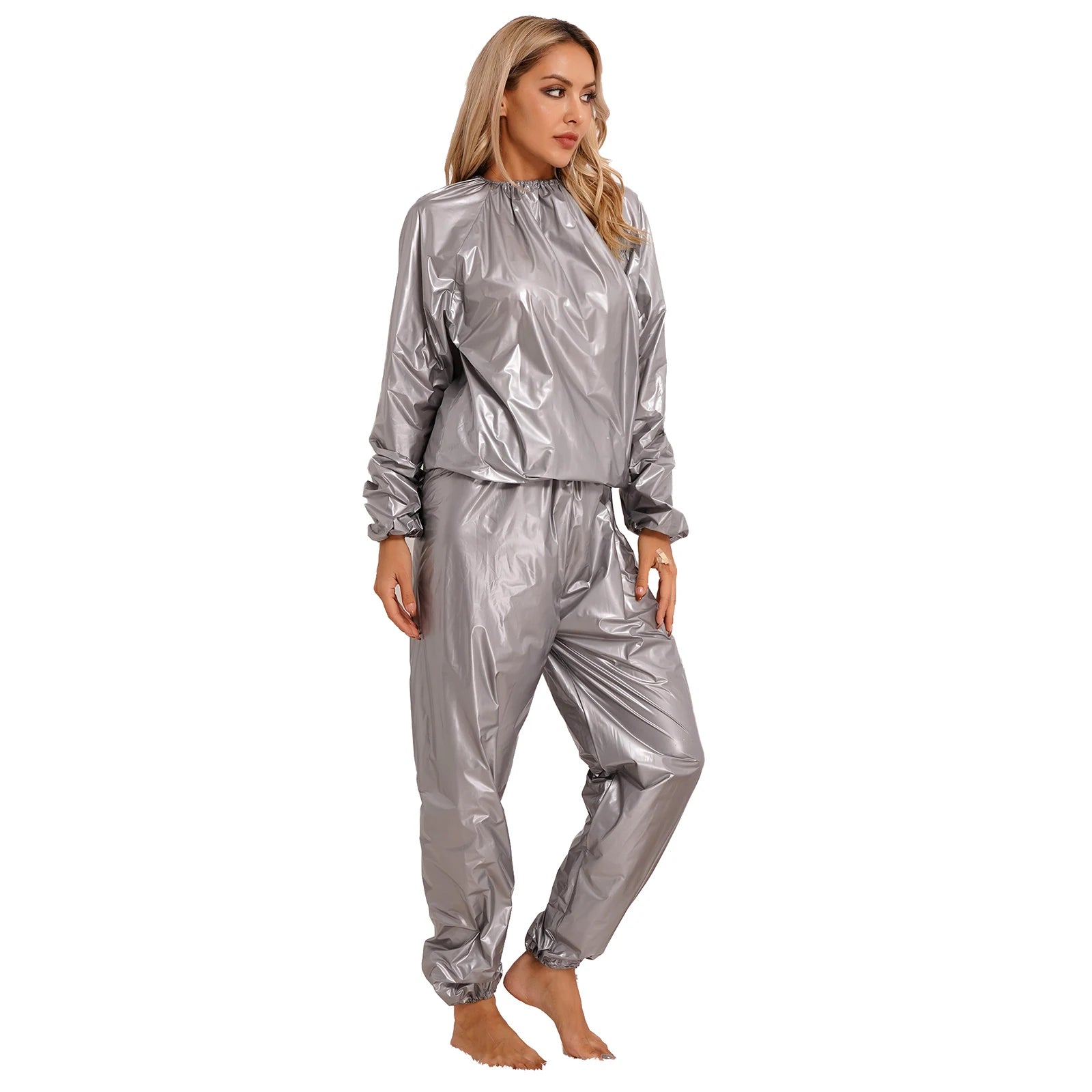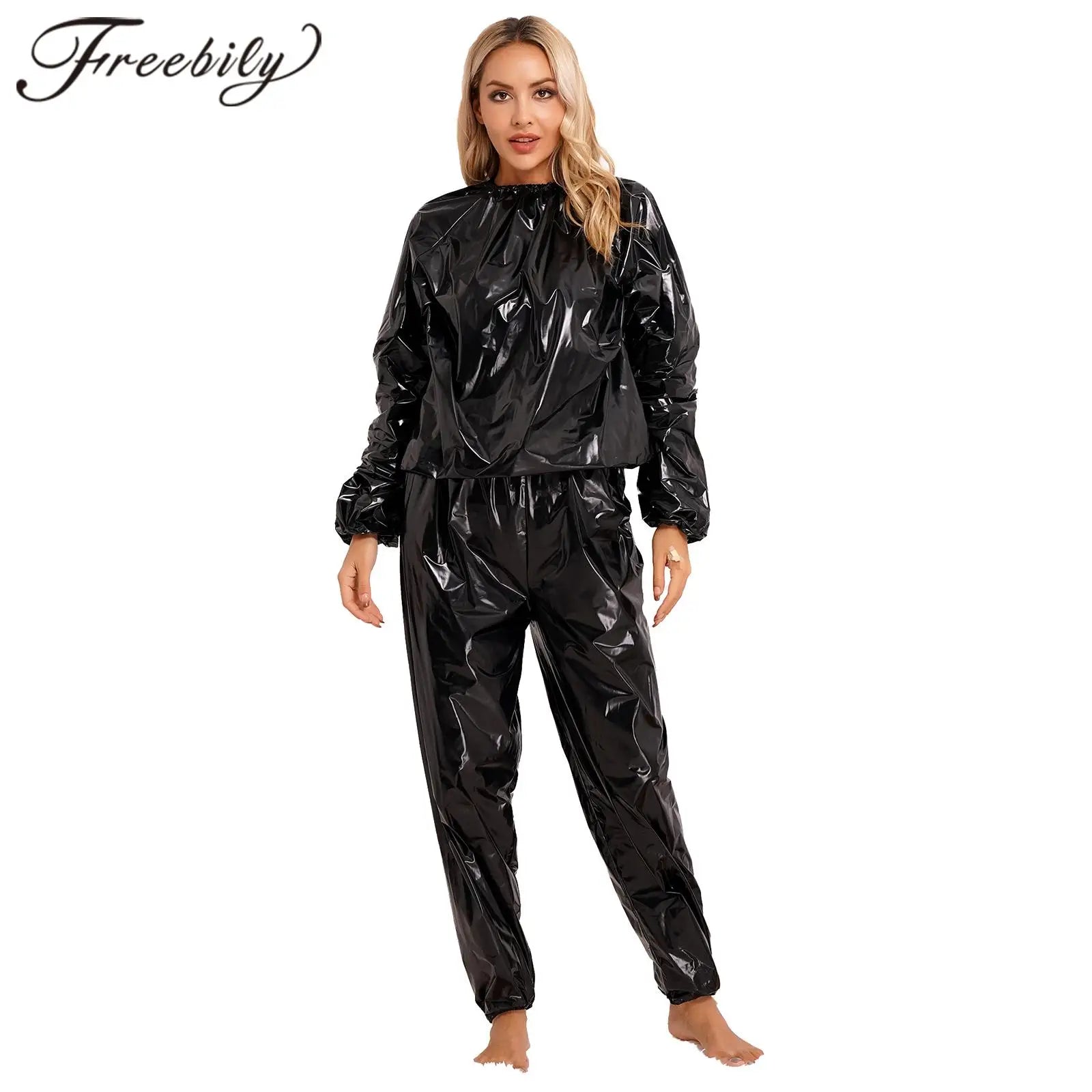 2Pcs Women Sauna Suit PVC Long Sleeve Elastic Cuff Top Pants Set Fitness Gym Workout Outfit Sweat Suits for Adults Clothes Sets