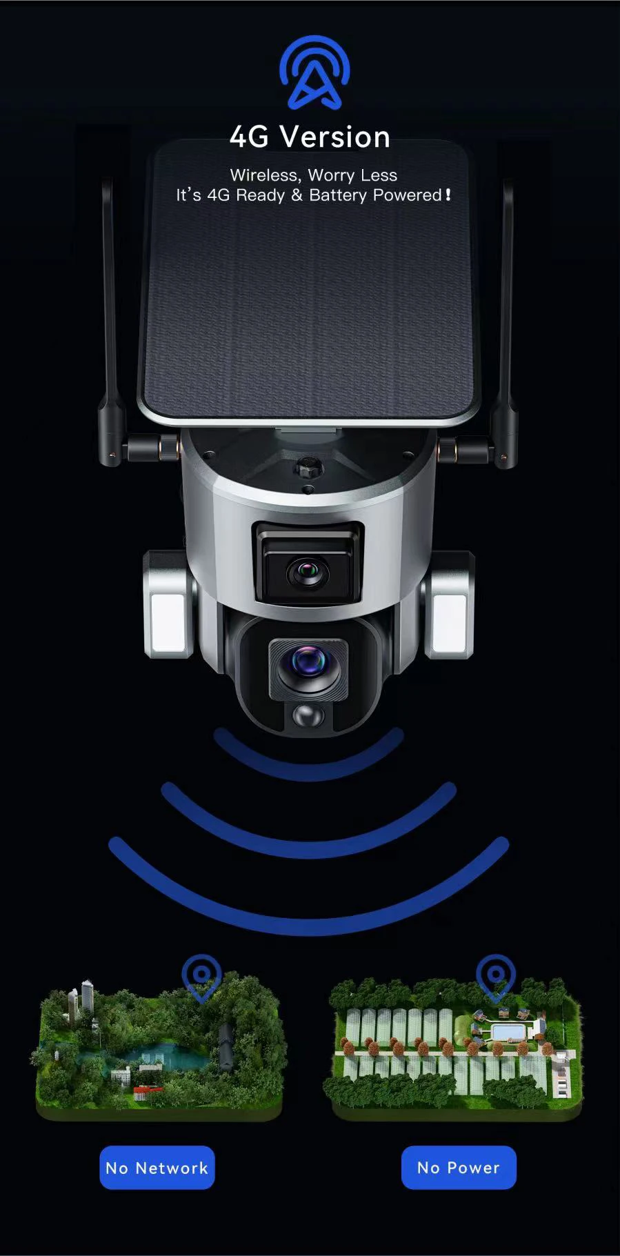 1.Our camera only uses 4G SIM card and does not support connecting to 3G/GSM/home WiFi. No need for network LAN cable, no need to set up wifi,no need to connect power wires.