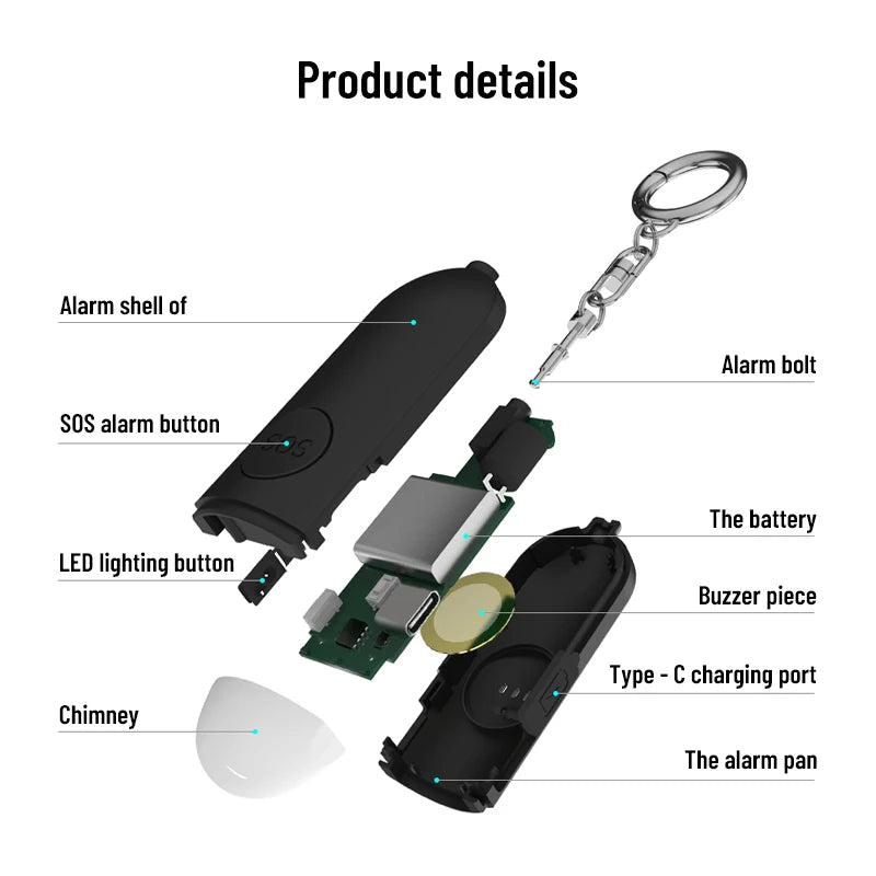 2. **Dual Alarm Modes:** Pull the latch to sound the 130dB loud alarm, or double-click the SOS button to activate the alarm - either mode will instantly draw attention and scare off potential threats.