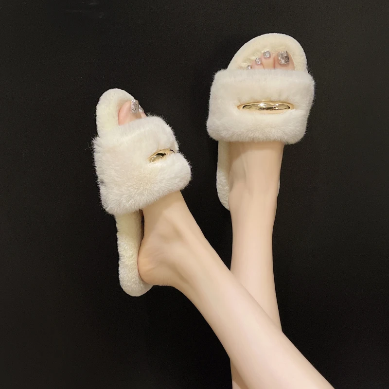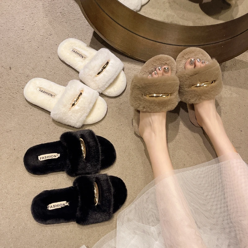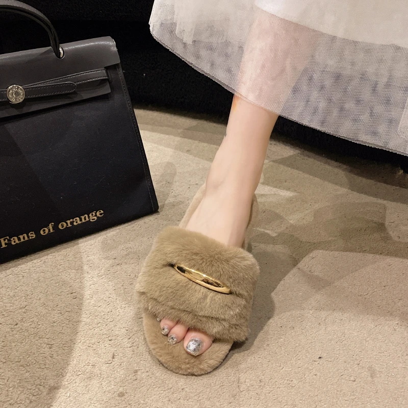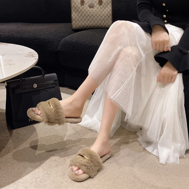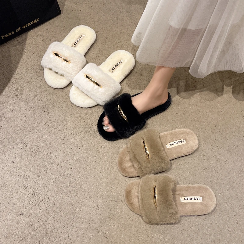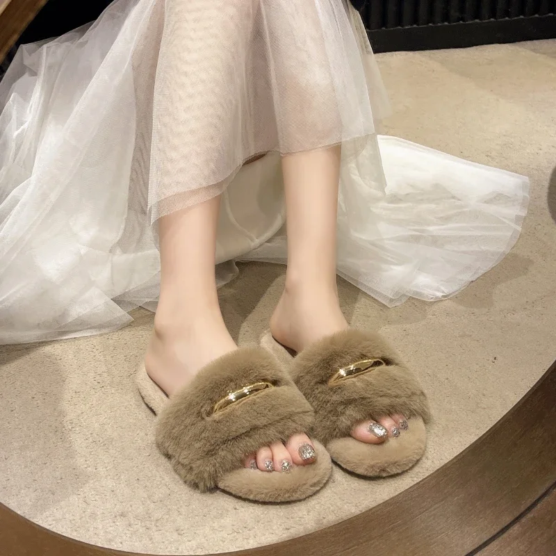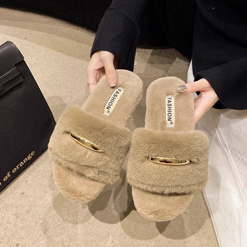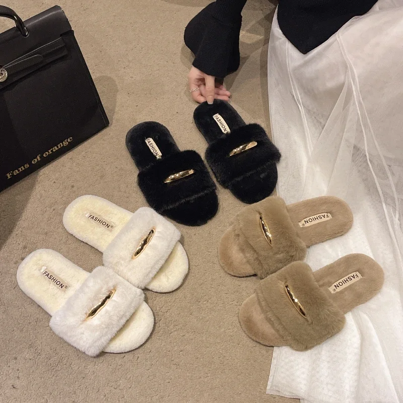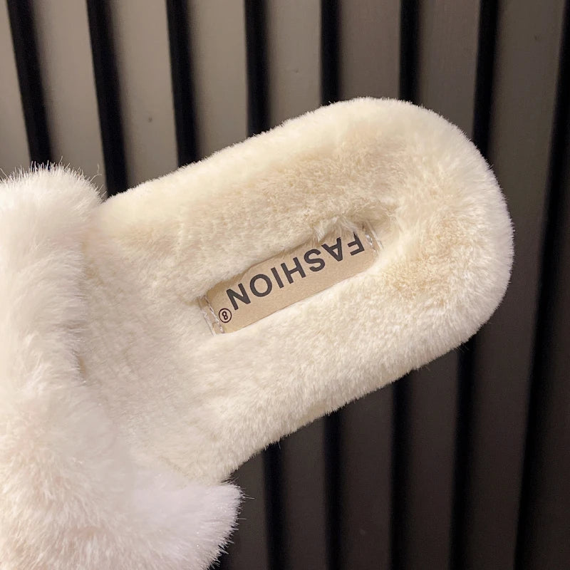 Fashion Winter Warm Women Slippers Cozy Faux Fur Cross Indoor Floor Slides Flat Soft Fluffy Female Celebrities Home Cotton Shoes