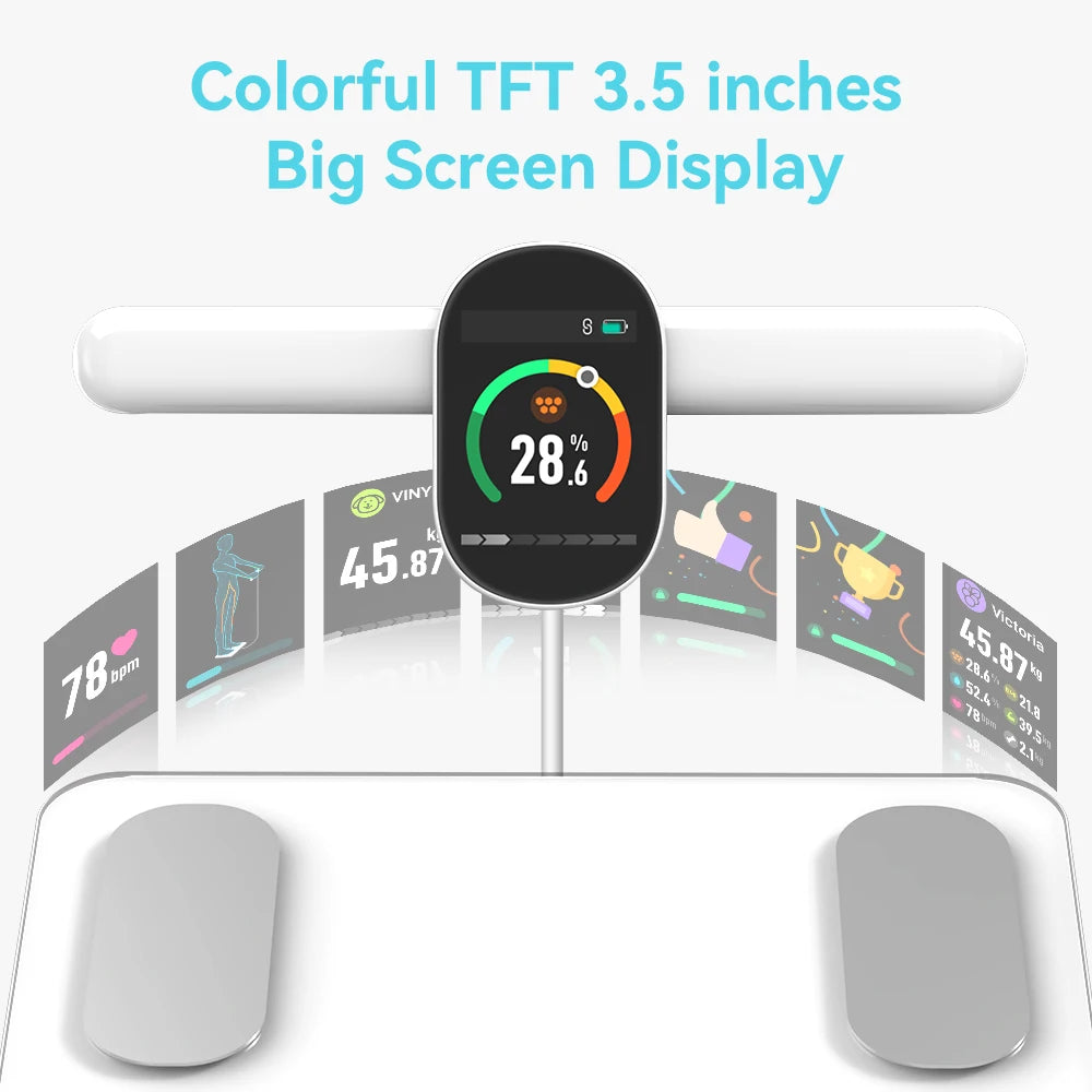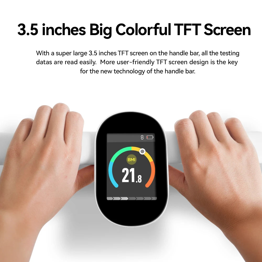 Smart Body Scale with a super large 3.5 inches TFT screen on the handle bar, all the testing datas are read easily. More user-friendly TFT screen design is the key for the new technology of the handle bar.