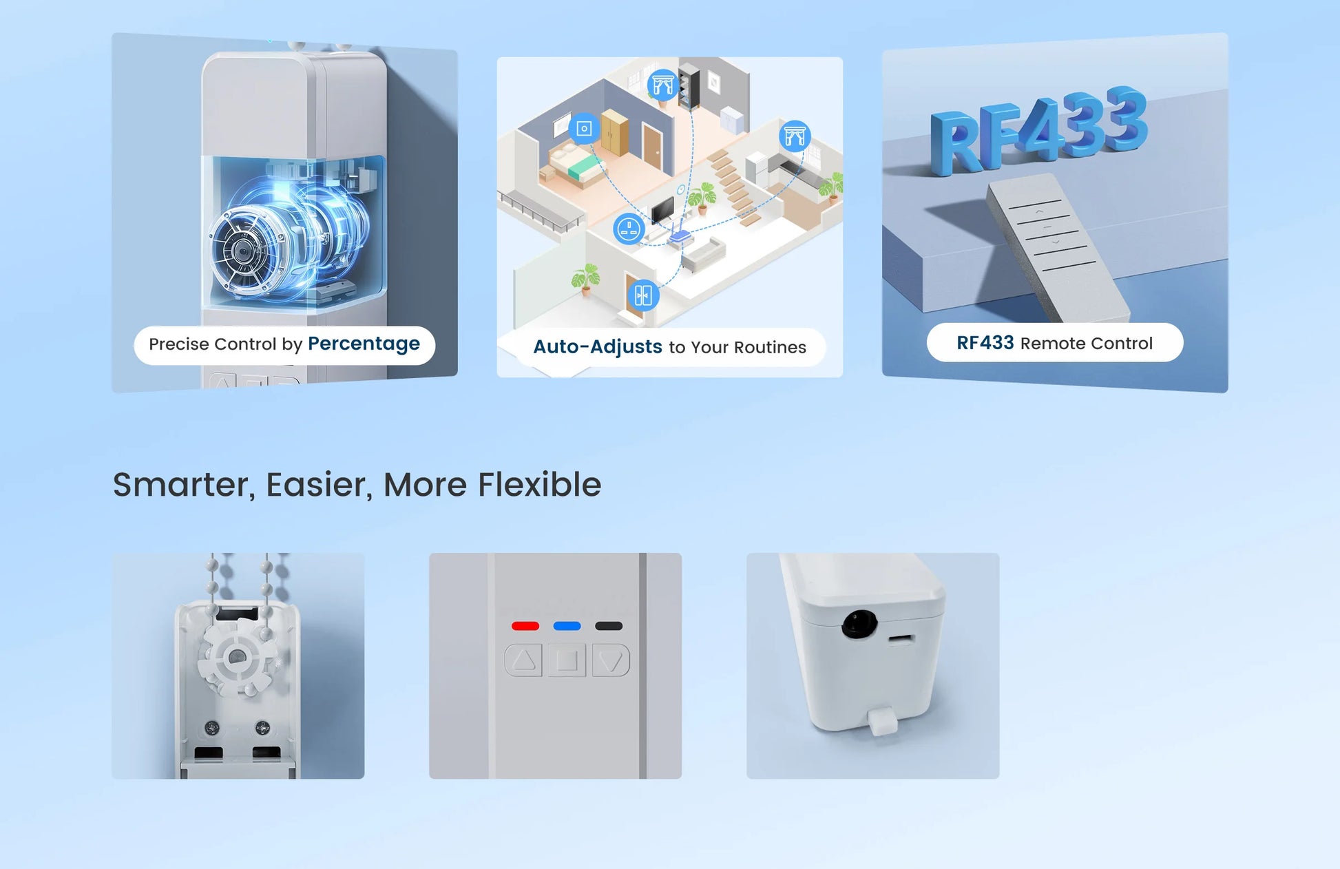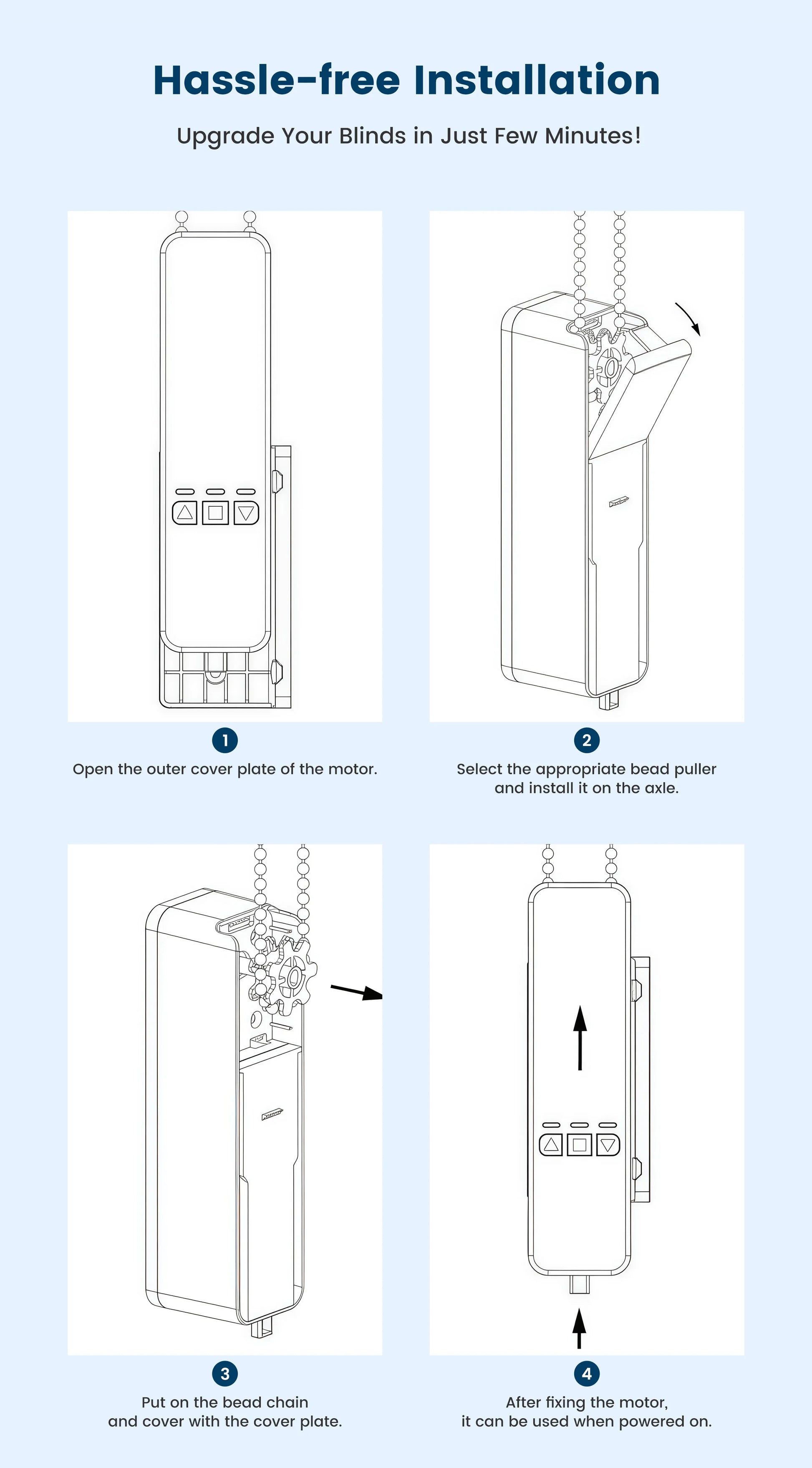 Seamlessly install using integrated gears and adhesive tape in just a few straightforward steps. Transform your existing roller or shutter blinds in minutes with minimal effort.