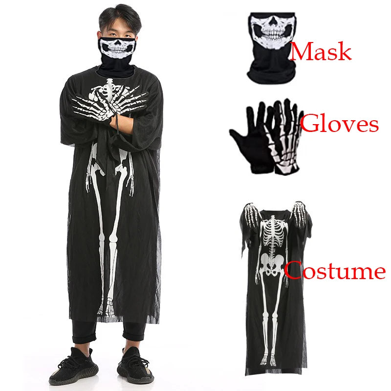 Halloween Scary Skeleton Ghost Cosplay Costume Masks Gloves Costume Suit Masquerade Carnival Horror Clothes for Adults Kids