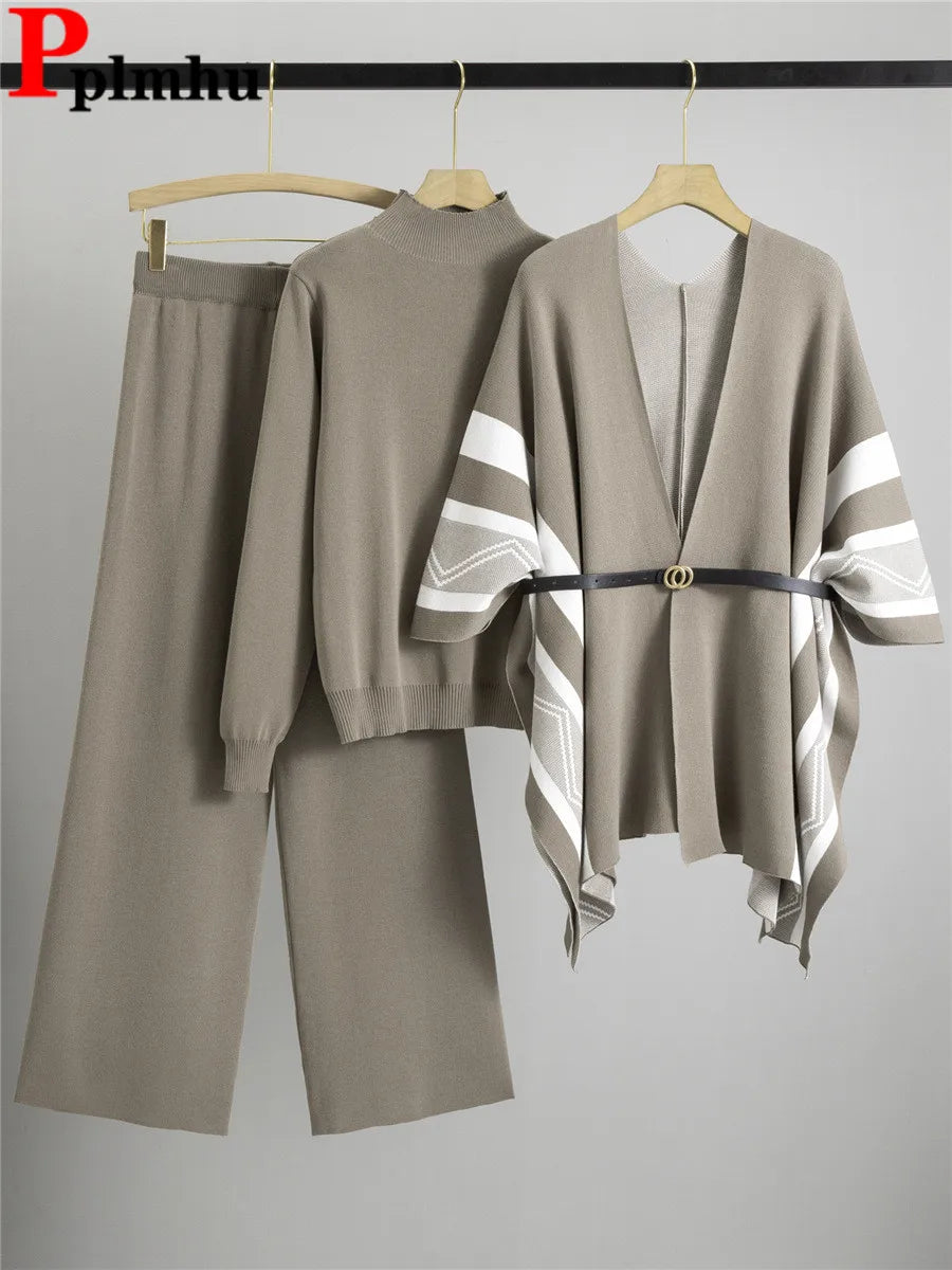 Korean Elegant Knitted 3 Piece Sets Women Sweater Pullover+chic Design Shawl Tops Conjuntos High Waist Wide Leg Pants Outfit New