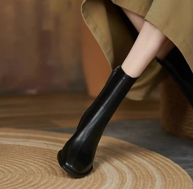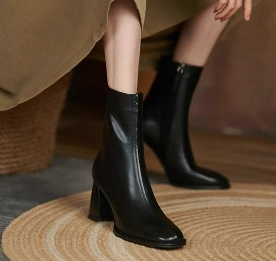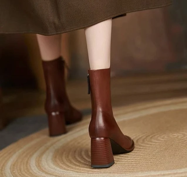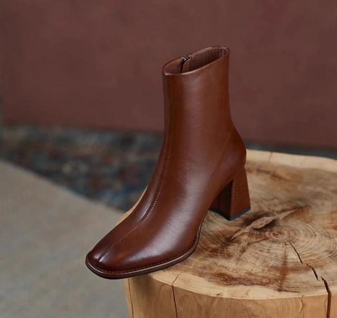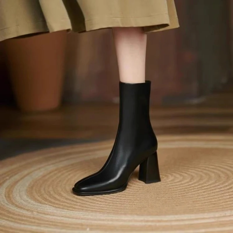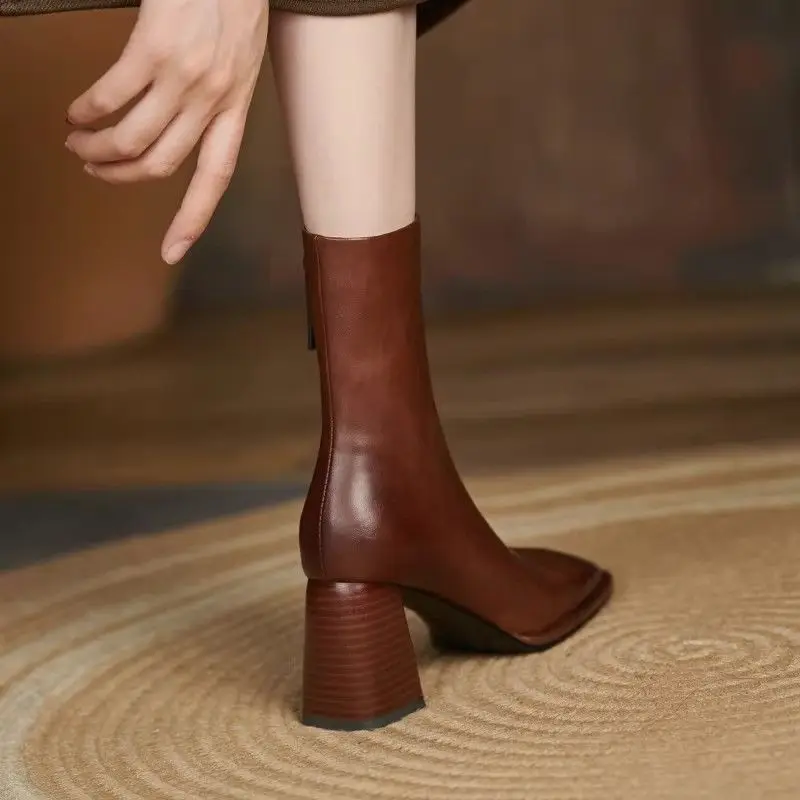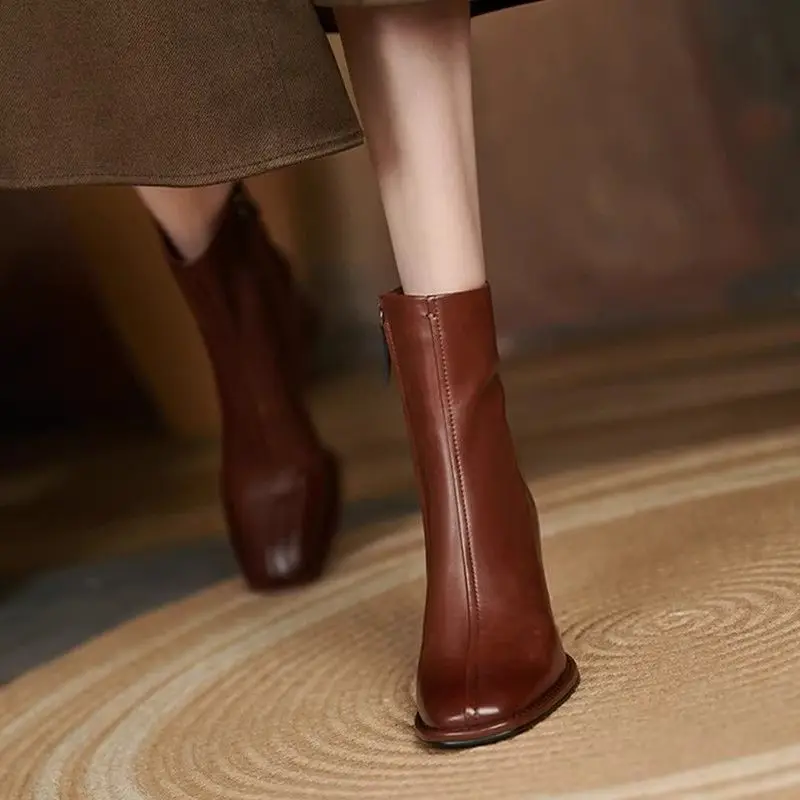 Leather Square Toe Heeled Booties Fleece-Lined Women's Ankle Boots Autumn Winter Female Short Shoes Trend 2025 on Offer Footwear
