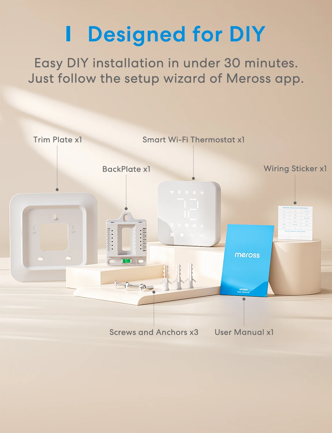 •Save on Energy Bills: Track your heating and cooling usage with the Meross app to conserve resources and save money. Save up to 30% per year. * Compared to non-smart thermostats.