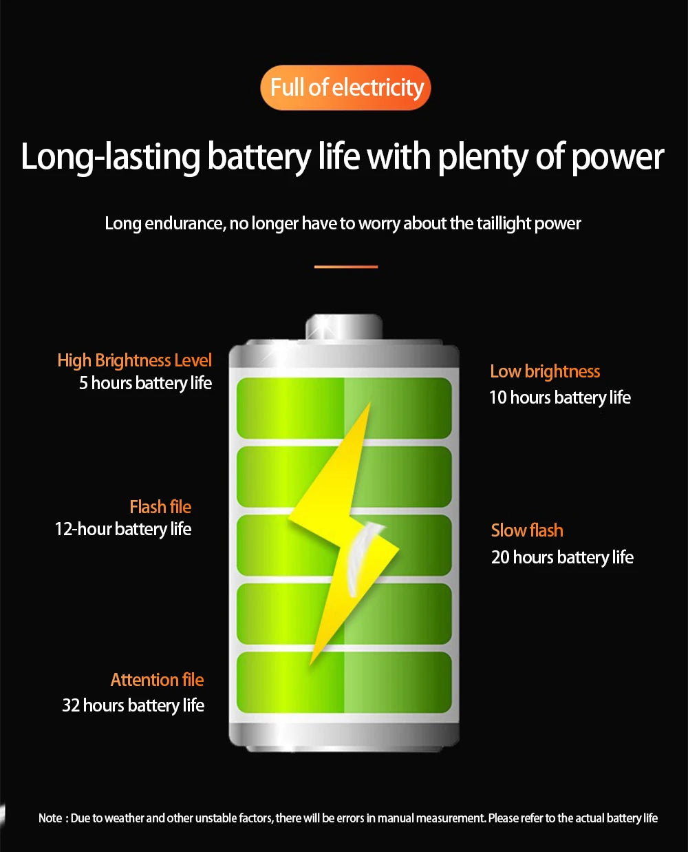 4. Sufficient battery power: Long battery life, sufficient battery, long battery life, no need to worry about the tail lights running out of battery.