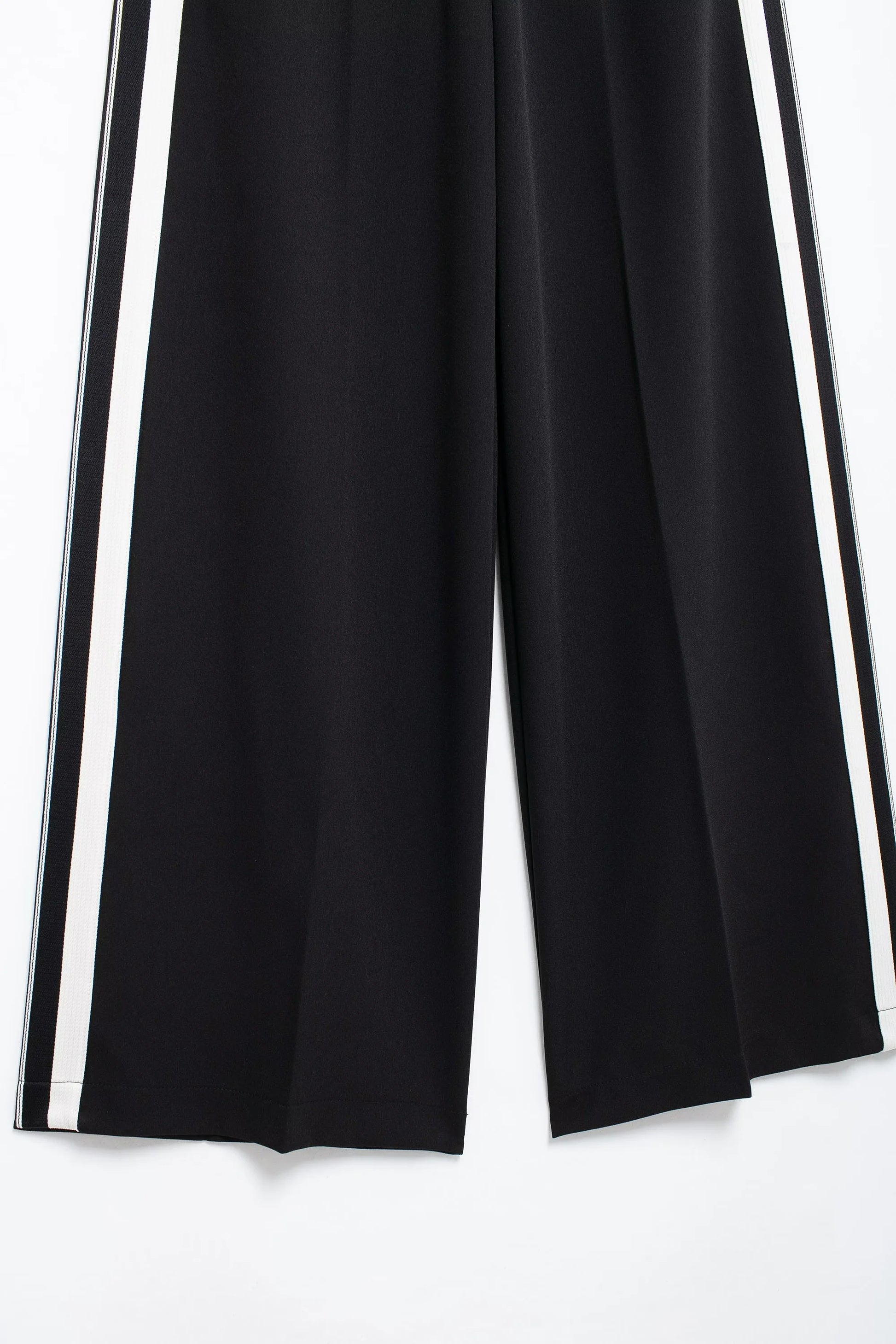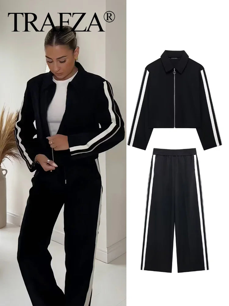 TRAFZA 2024 New Women Casual Black Trousers Suits Sports Short Jacket + Female Vinatge Black White Patchwork Baggy Pants Street