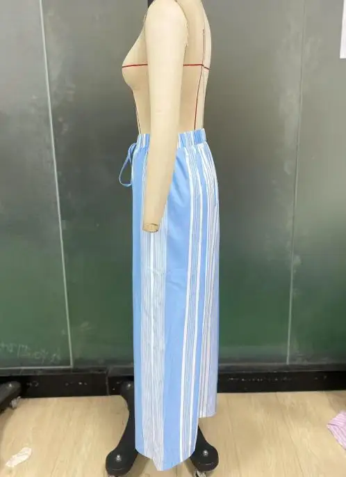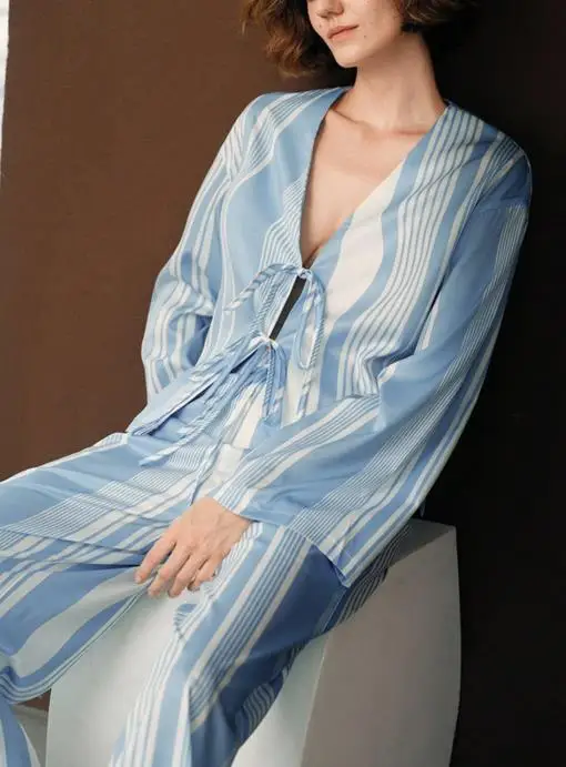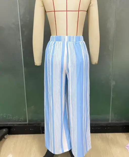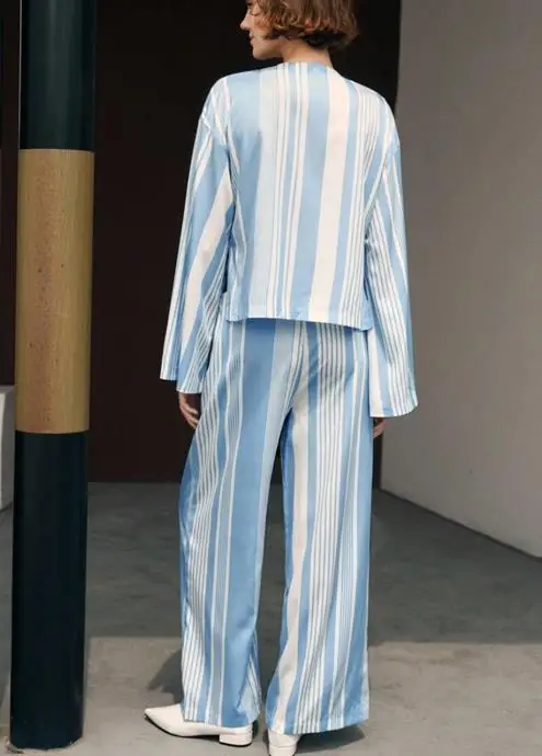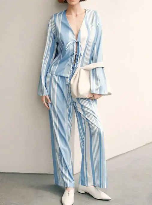 Two Piece Set Women Outfit Spring Autumn New Temperament Striped Long Sleeved Lace Up Shirt & Casual Straight Leg Pants Set