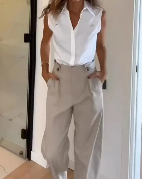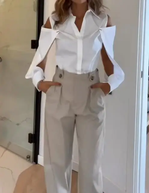Two Piece Set Women Outfit Spring Summer New Elegant Off Shoulder Turn-Down Collar Shirt & High Waist Straight Pants Set