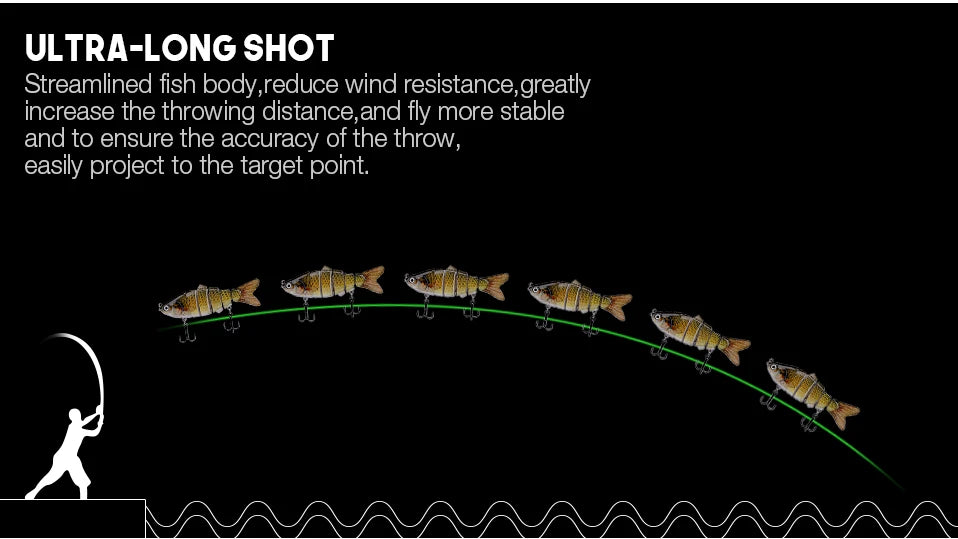 2)MULTI JOINTED BODY - The body pieces connect with textile fabrics allows this lures wiggles to side to side like a real fish would swim.