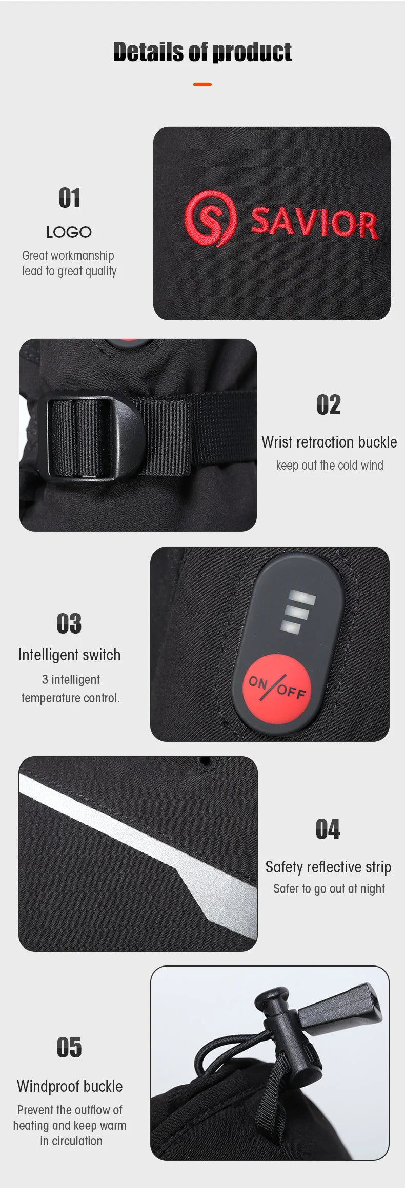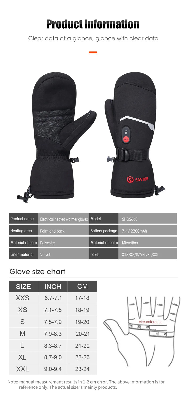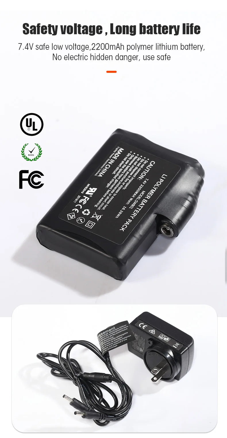 The Gloves are equipped with a 7.4v UL / CE certified 2200mAh lithium ion rechargeable battery. It adopts high-quality materials and dual cable charging system, which can charge the battery at the same time and facilitate the removal of the battery.