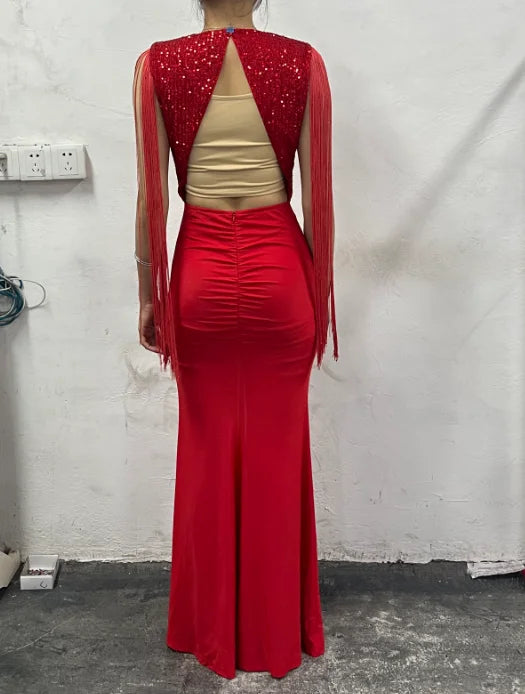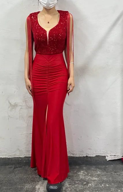 Womens Dresses 2024 Summer Fashion Contrast Sequin Ruched Slit Tassel Design Sexy Plunge Short Sleeve Skinny Maxi Evening Dress
