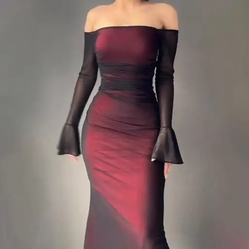 Womens Dresses Spring Autumn New Fashionable Solid Color Long Sleeved Off Shoulder Hip Hugging Temperament Slim Fit Dress