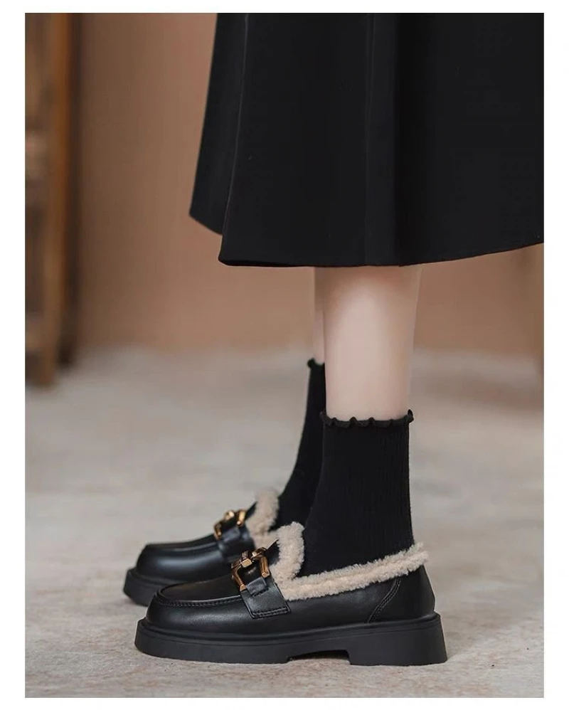 Women's Fur Lined Loafers Chunky Platform Winter Shoes Horsebit Slip On Comfortable Flats