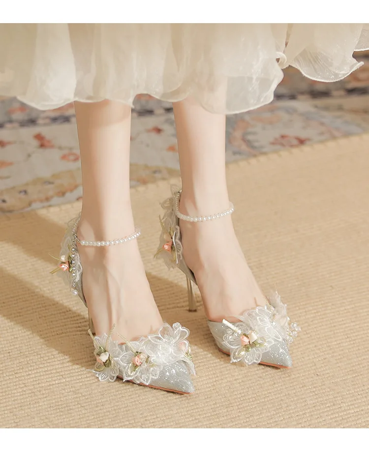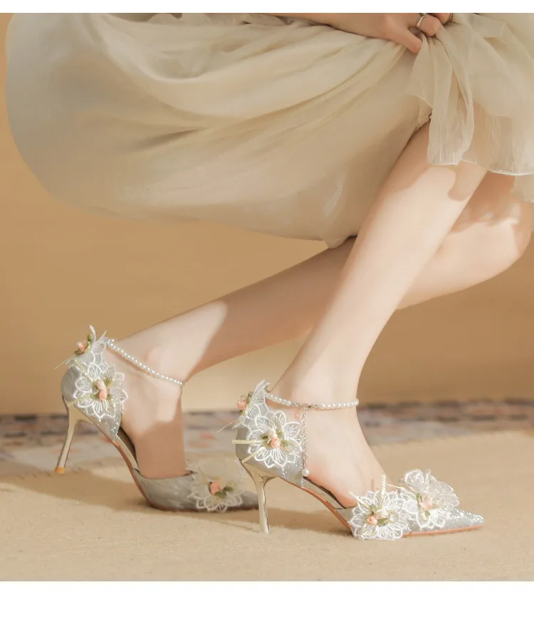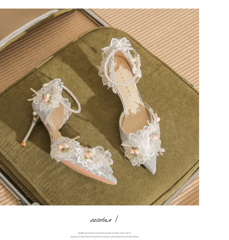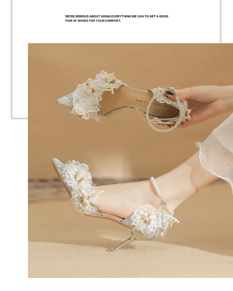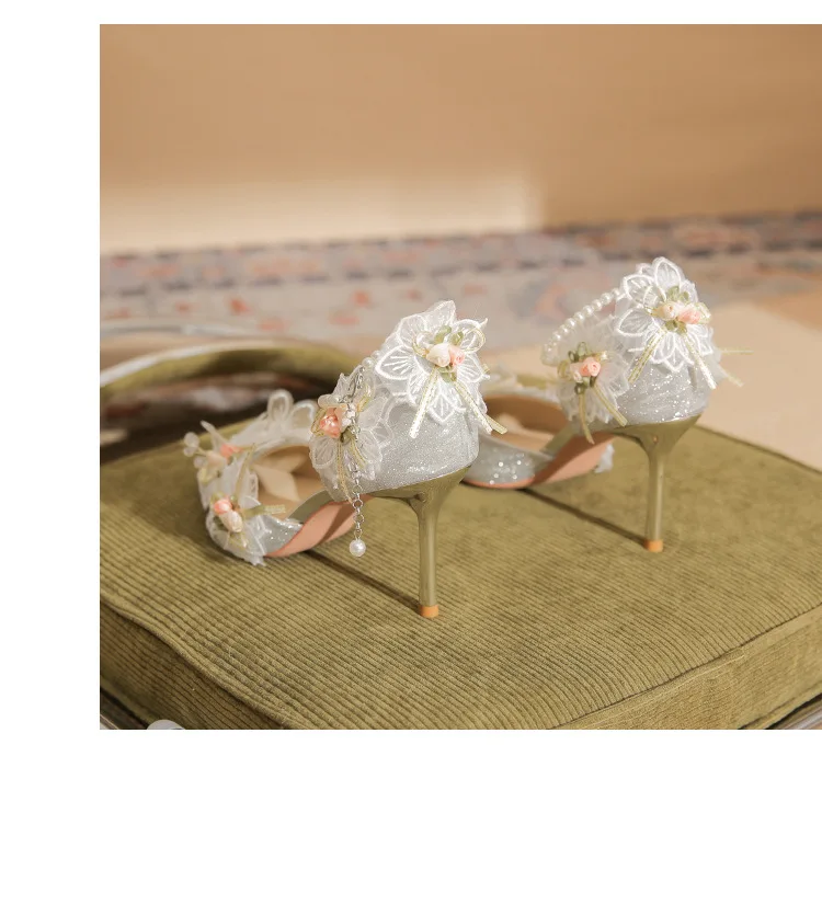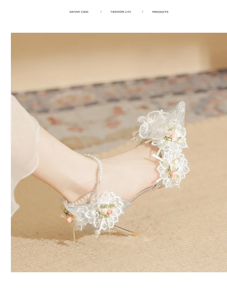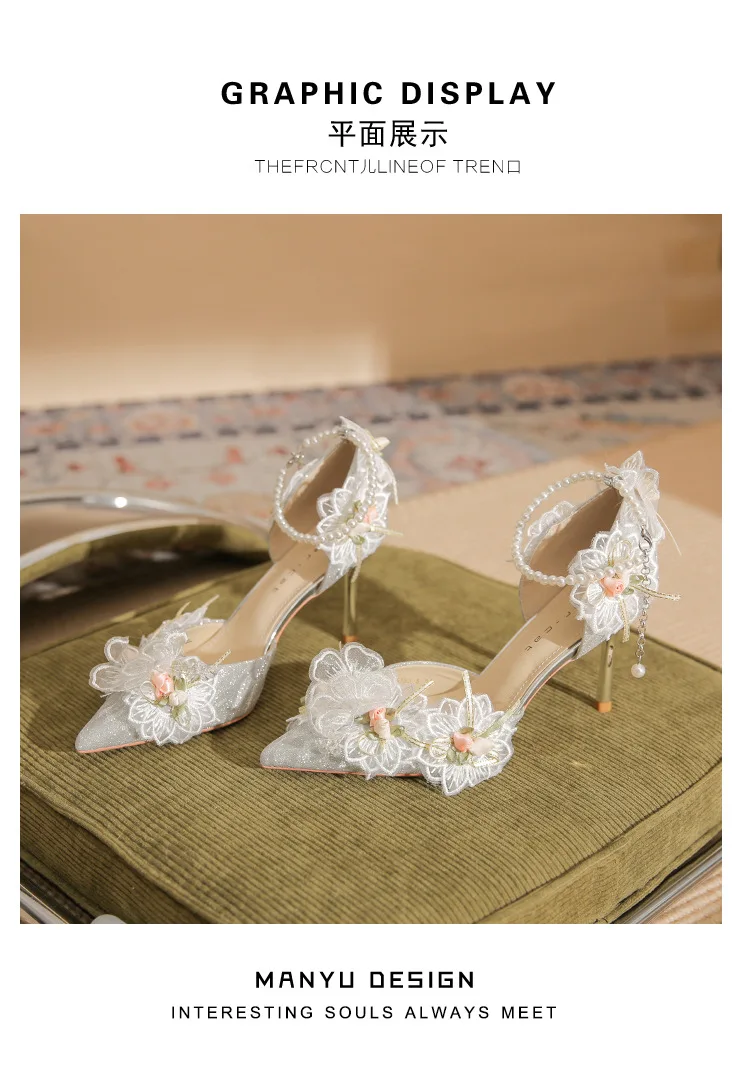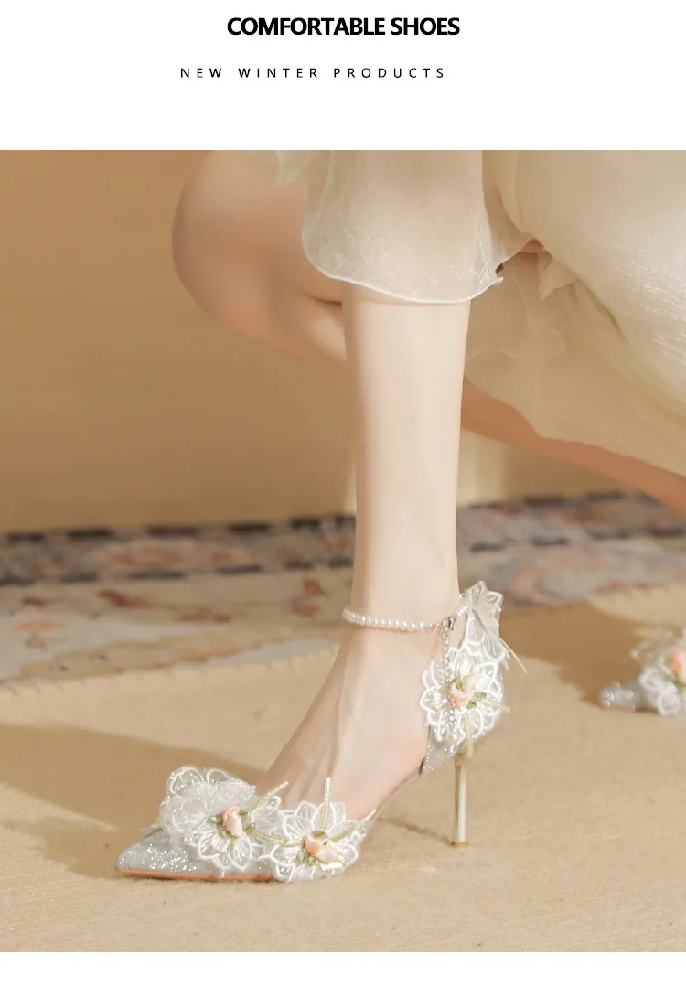 Women's Pumps Elegant Lady Evening Party Dress Prom Shoes 8CM Lace Flower Pearls Single Shoes Spring Summer Pointed High Heels