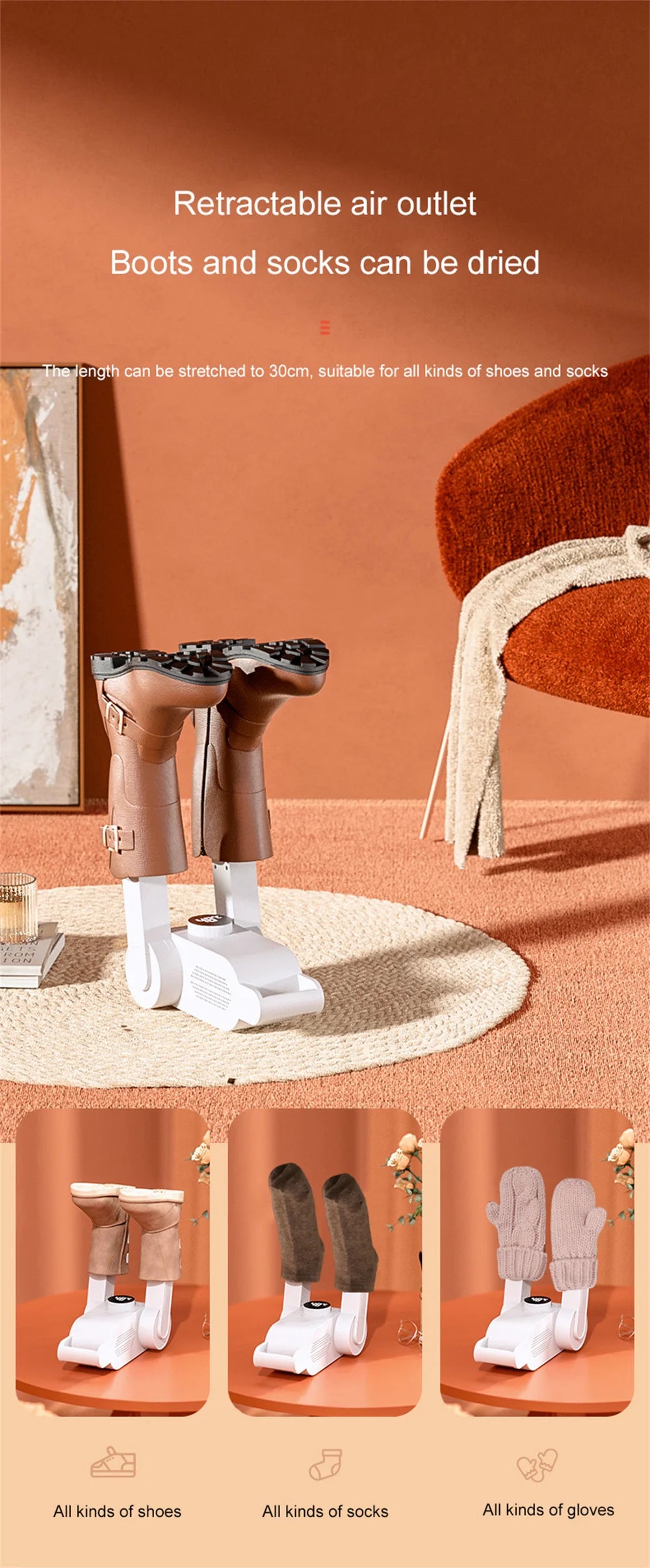 5. Wide compatibility: This versatile dryer is suitable for use with various types of footwear, including sneakers, boots, and more, making it a must-have addition to any household.