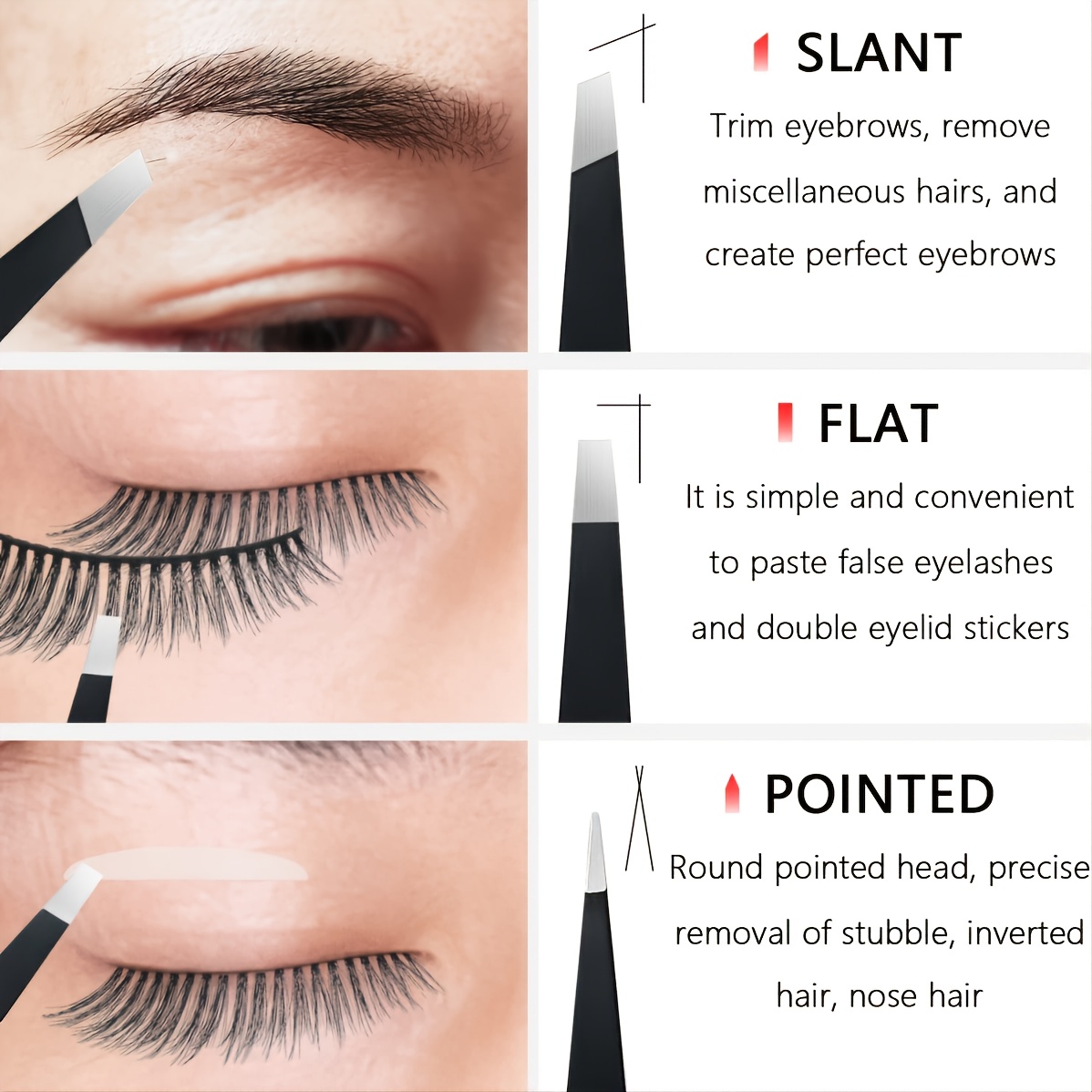 Versatile: 3 different types of tweezers (flat, slant, and pointed tip) for various hair removal needs.