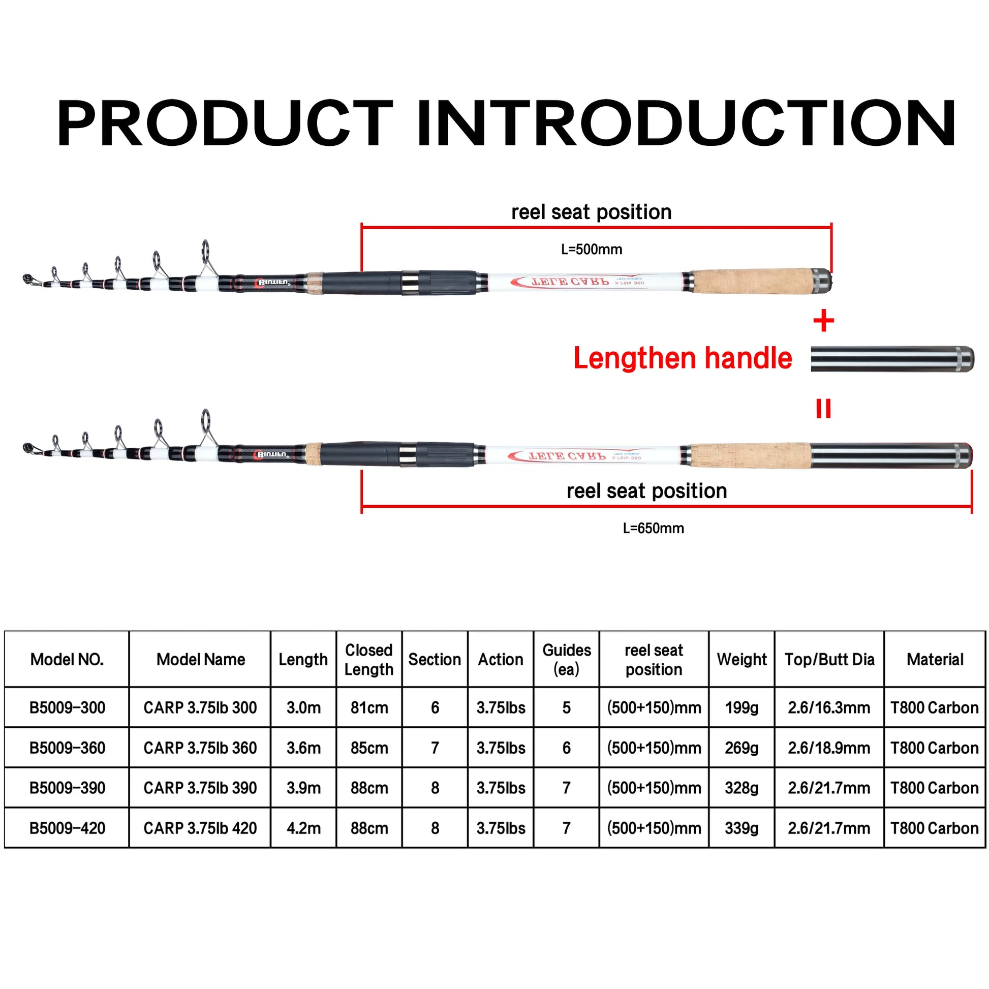BIUTIFU 3.75lbs Telescopic Carp Fishing Rods 3.0/3.6/3.9/4.2m T800 Carbon Travel Spinning Surfcasting 40-180g Lake Sea Hard Pole
