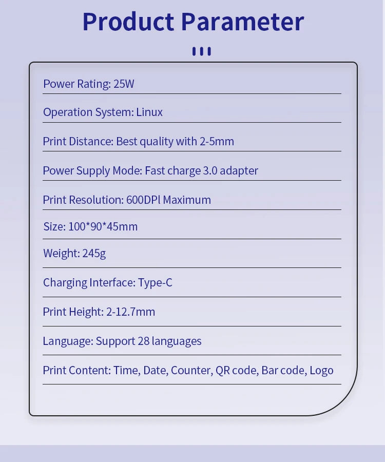 The portable smart mini handheld inkjet printer adopts an integrated design body, light weight, small size and fast printing speed.
