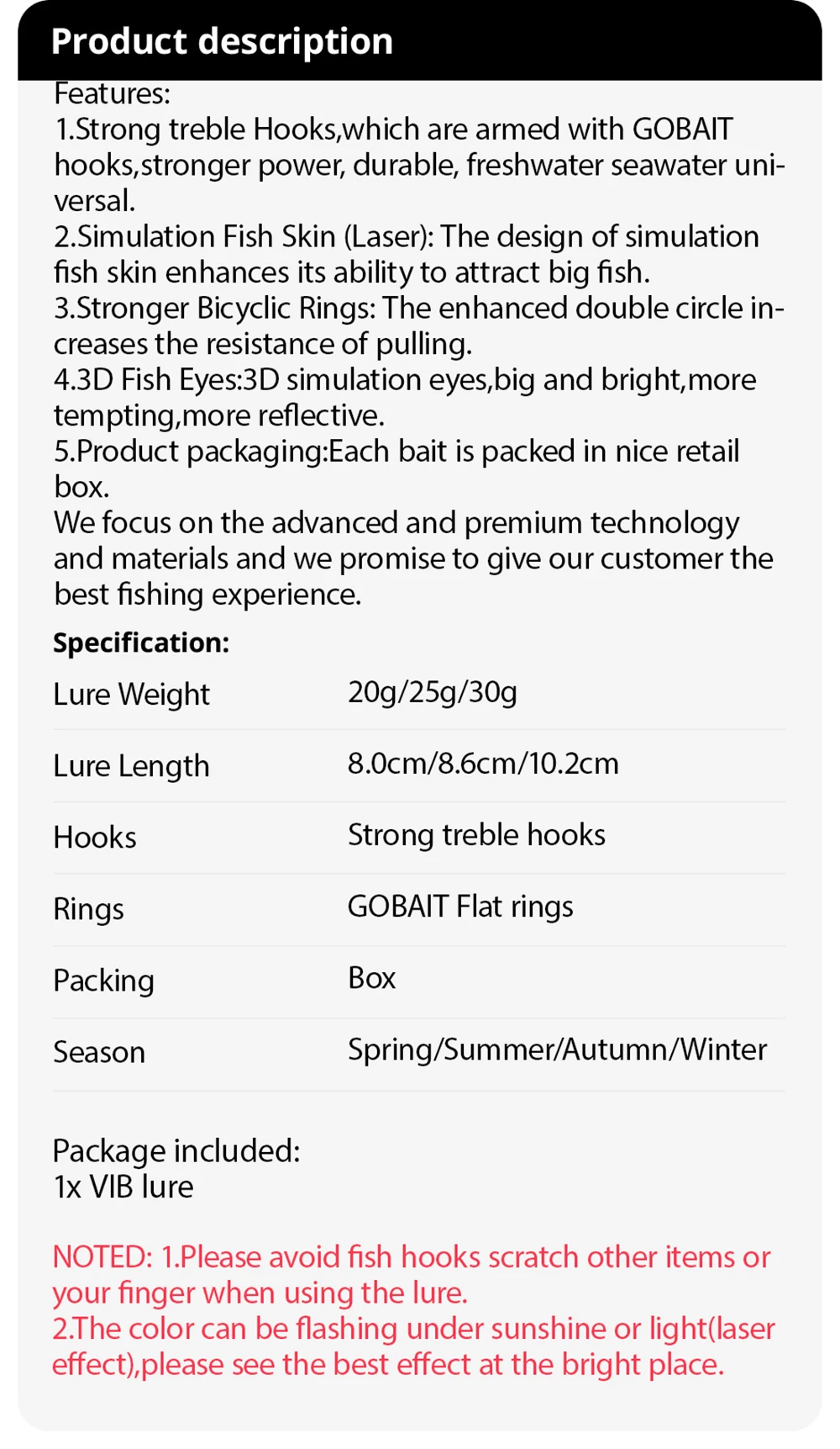 1.Please avoid fish hooks scratch other items or your finger when using the lure.
