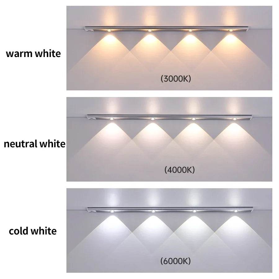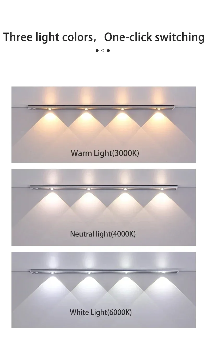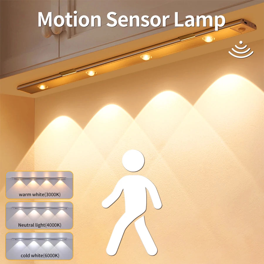 Motion Sensor LED Bar Light Rechargeable Cabinet Light 3 Colors Dimming Kitchen Light for Closet Wardrobe Stairs 20/30/40/50cm