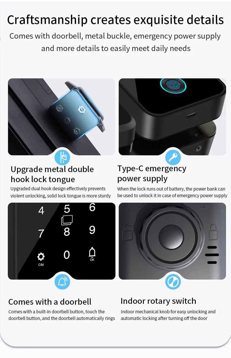 Ways To Unlock: App,Bluetooth,Card,Password,FINGERPRINT,APP,bluetooth,Card,Password,FINGERPRINT