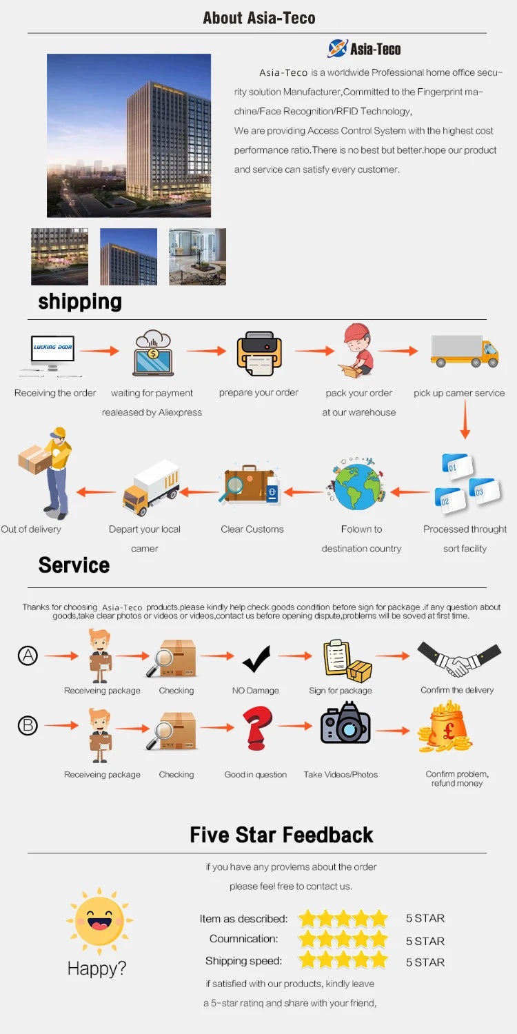 4.Low power consumption. 5pcs AAA batteries. Work continuously for 1 year. Support low power warning and protection, (Still could unlock for 100 times after the first low power warning)