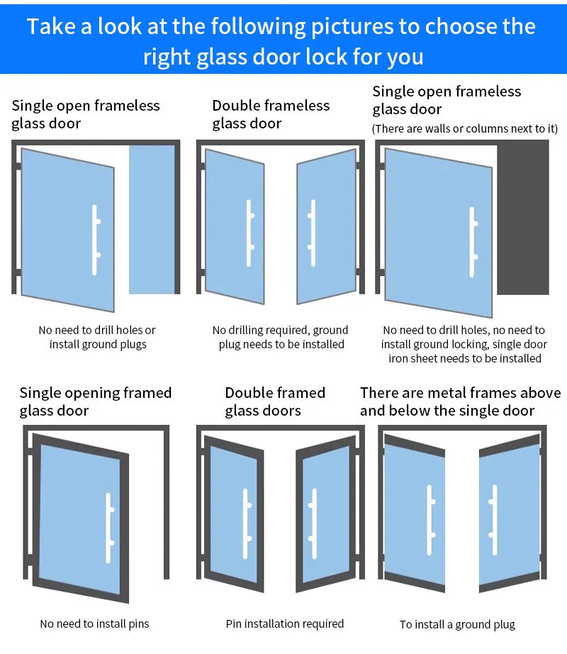 5.Suitable for multiple door: Double open glass door with or without frame, single open glass door. Please note that ground latch is needed to fix one glass to use this lock.
