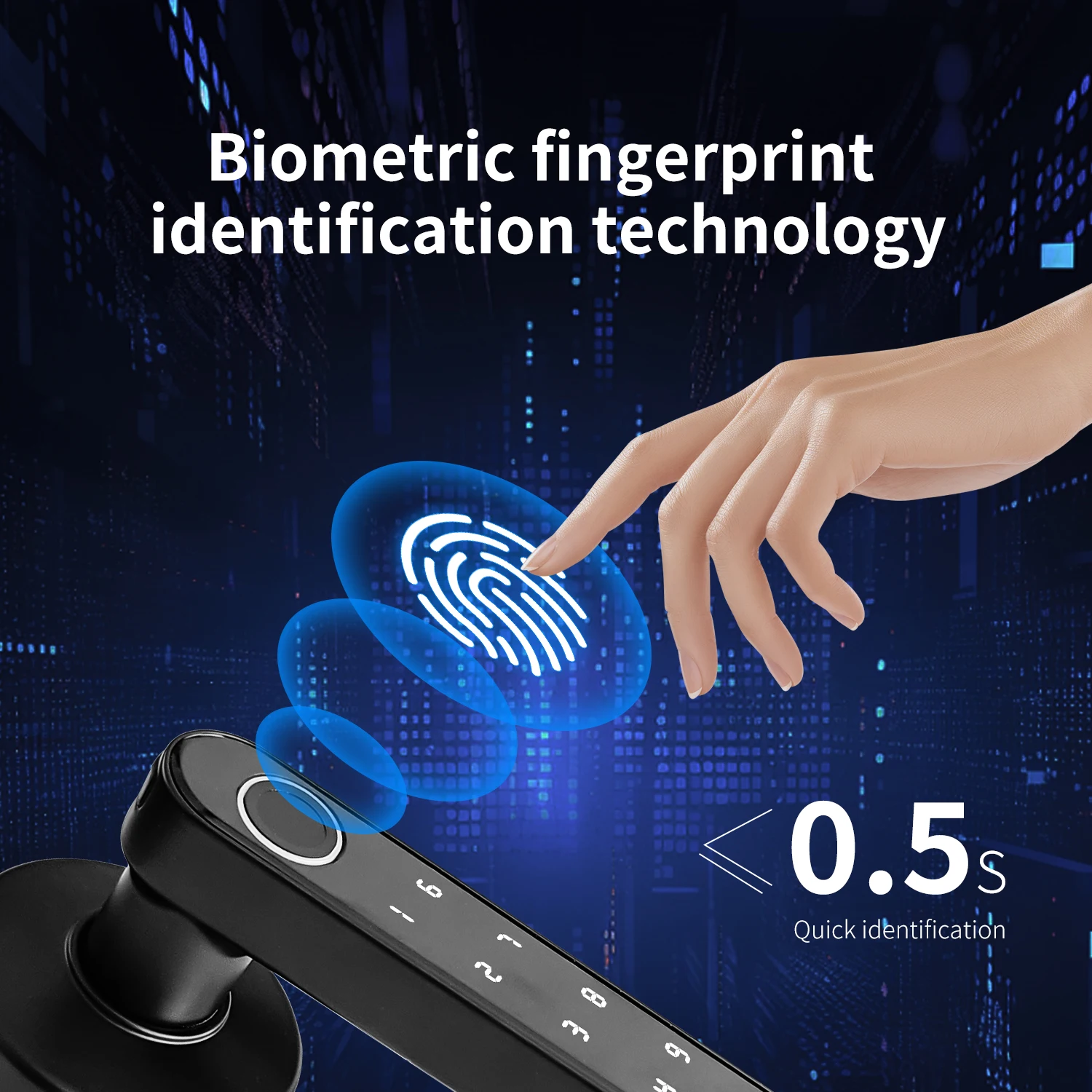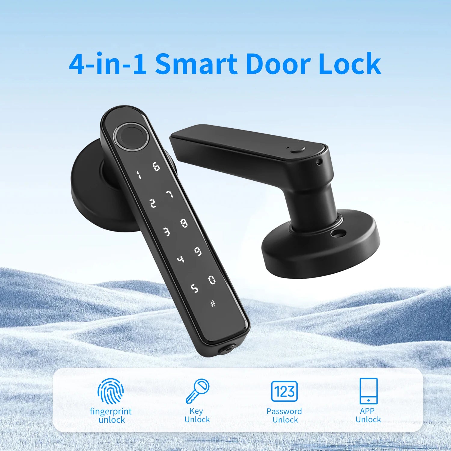 Smart Door Handle Lock – Offers four convenient unlocking methods: fast & secure fingerprint recognition, customizable 6-8-digit PIN codes, traditional mechanical key backup, and remote access via mobile app. Combines advanced security with smart home integration, ensuring keyless convenience and peace of mind. Durable, easy to install, and compatible with most doors.