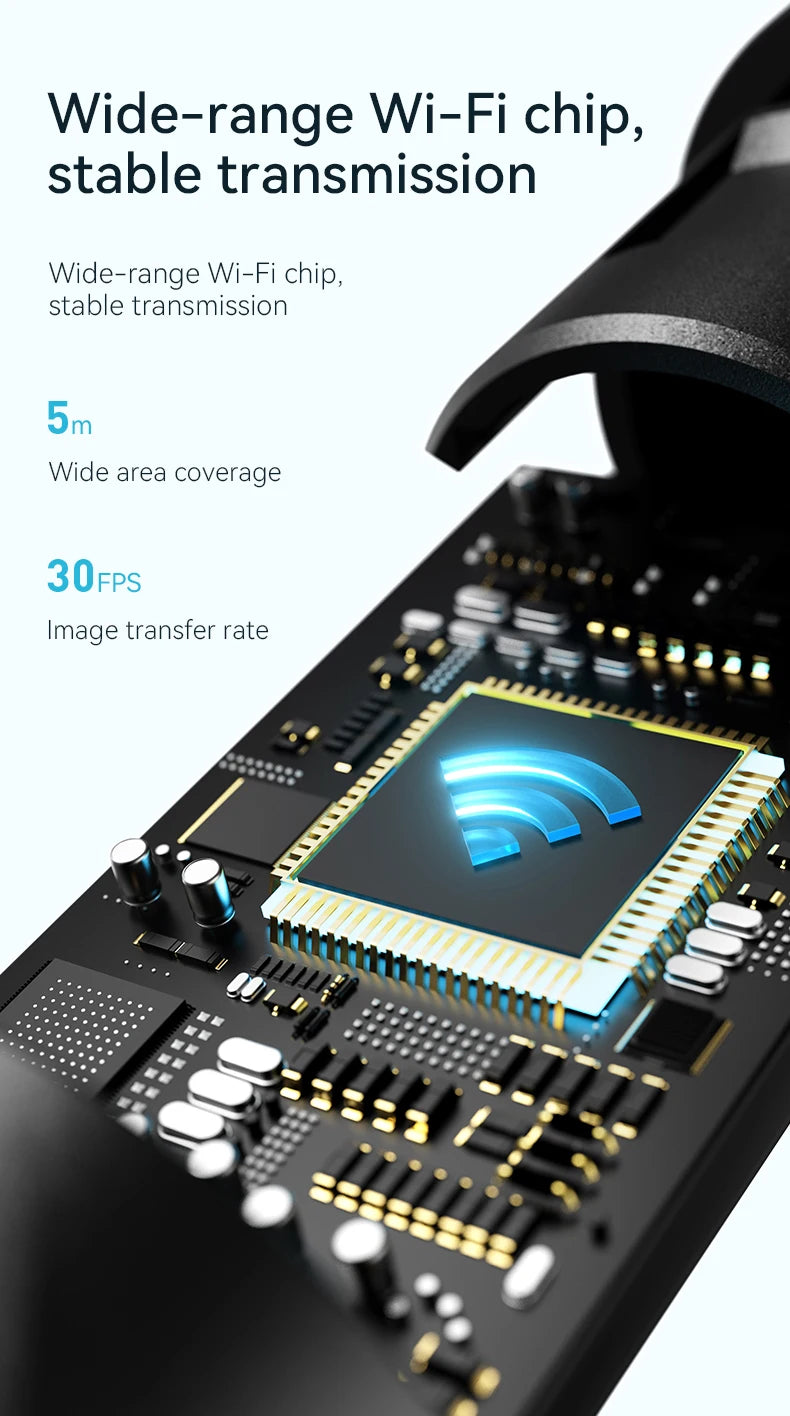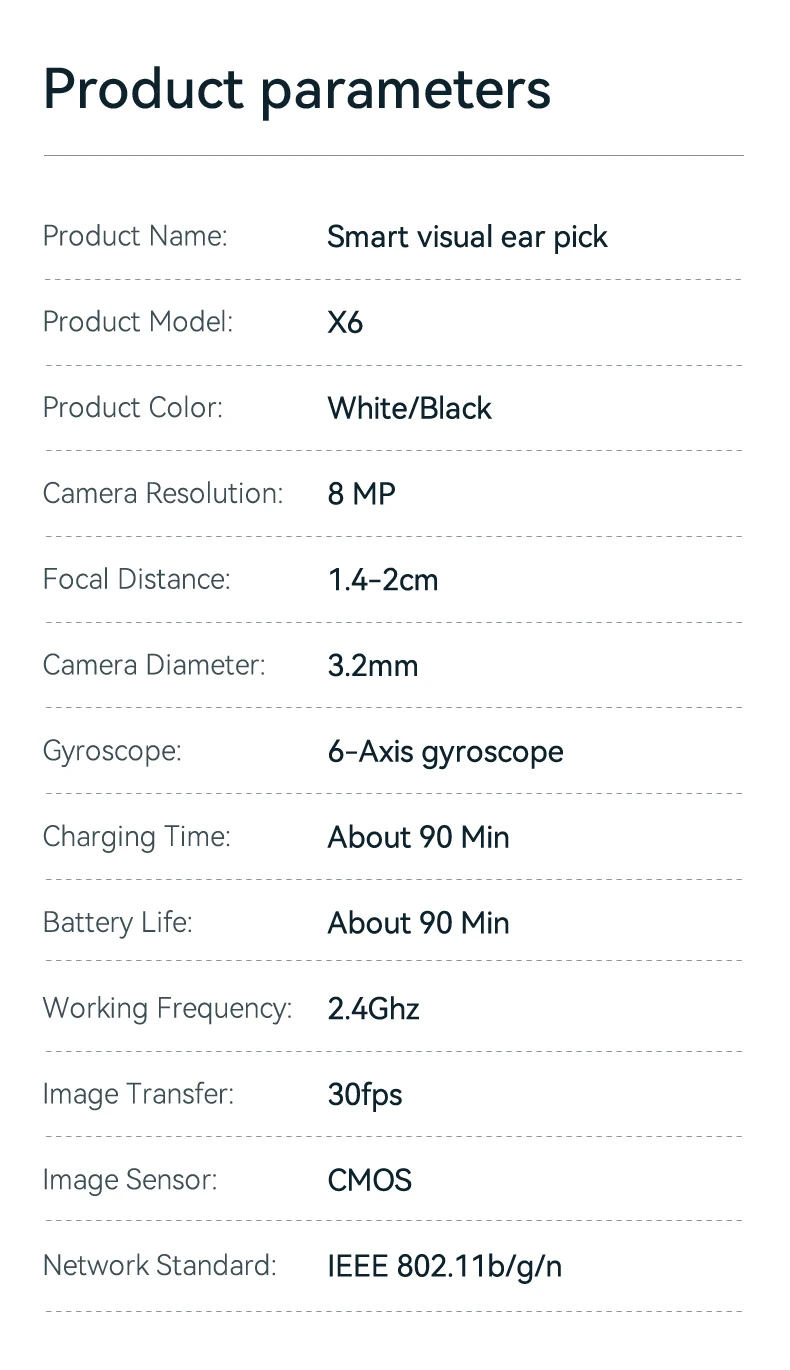 Support Android and IOS Devices: Scan the QR code to download the APP. Press and hold the switch button to turn it on, and connect the earwax camera through the device's WIFI to start using. The photos and videos taken by the device will be stored in the App album. If you want to save them in your phone album, please allow the App to access your album.