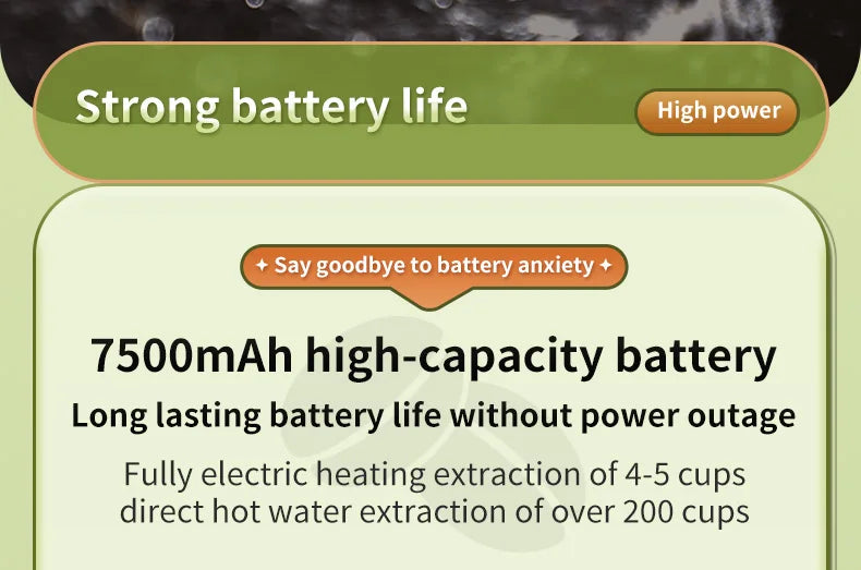 *Large-capacity battery, long-lasting life, heating extraction of 4-5 cups, direct hot water extraction of more than 200 cups