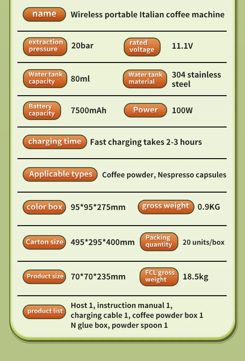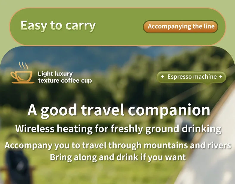 *Battery wireless heating, no need to bring your own hot water, a cup of espresso anytime, anywhere.